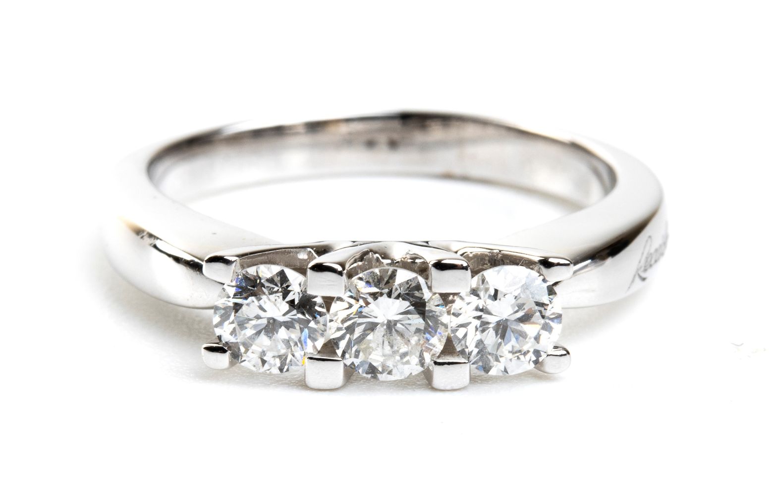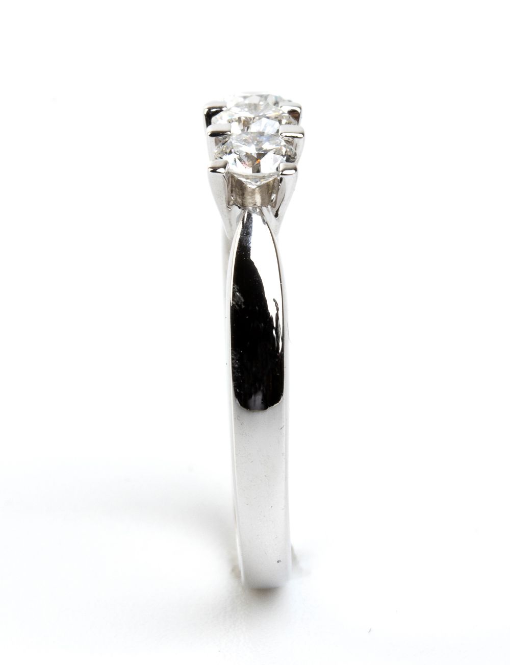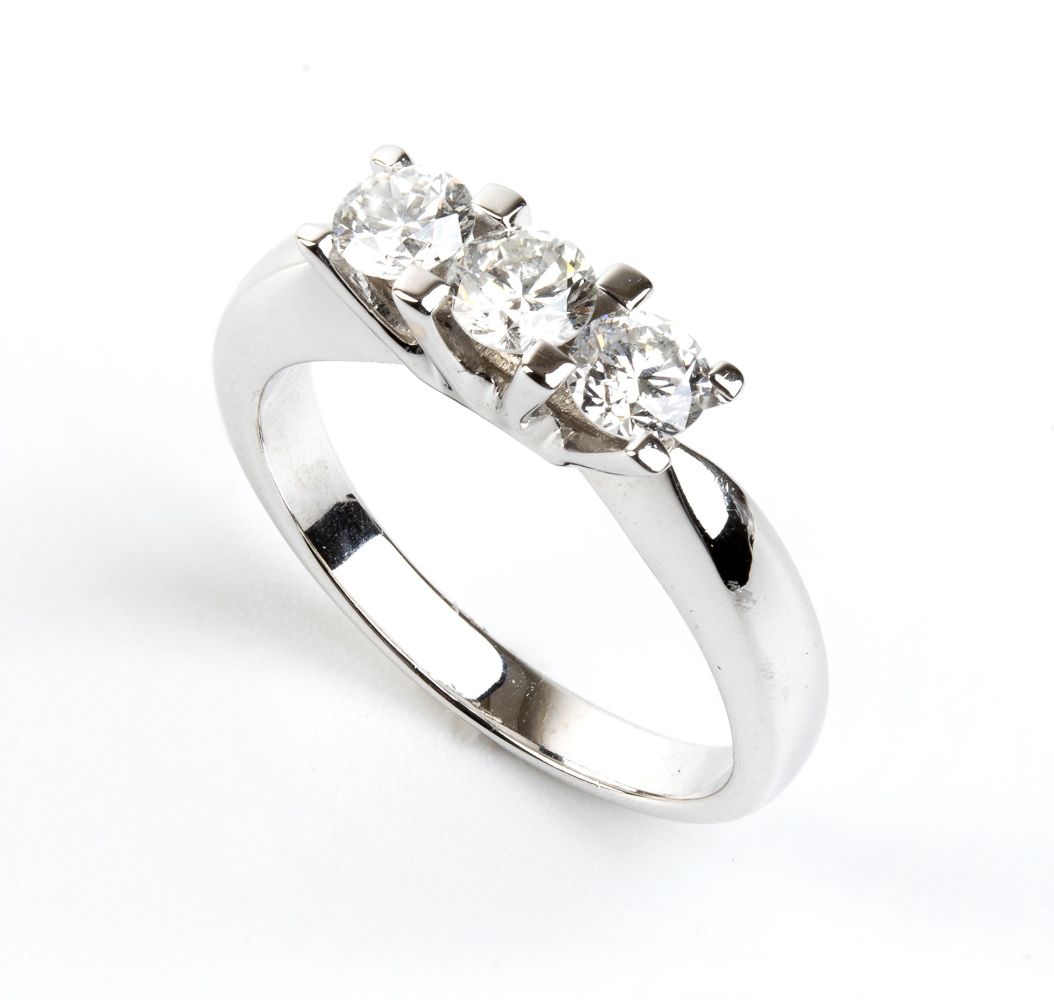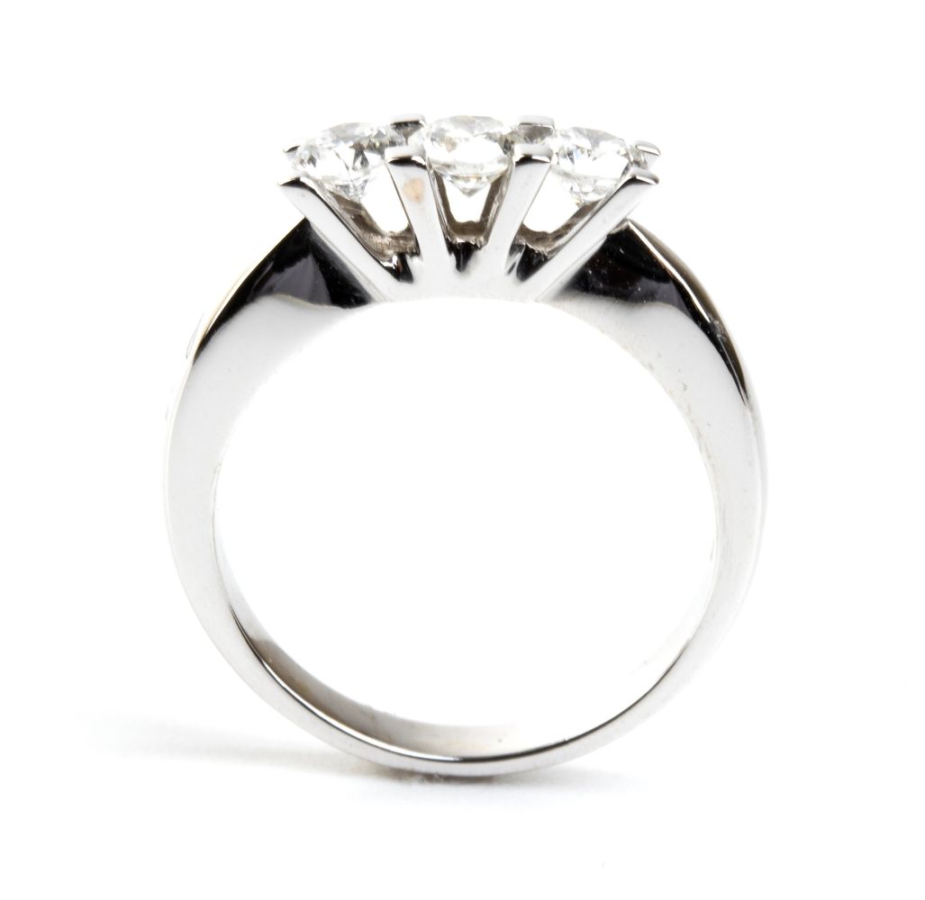 oro bianco 18k, incastonato con tre diamanti. N. 03 diamanti di forma rotonda taglio brillante 0.60 ct circa, F-G, VS-SI. Punzonato "750 - 1845 AL - MADE IN ITALY".