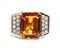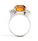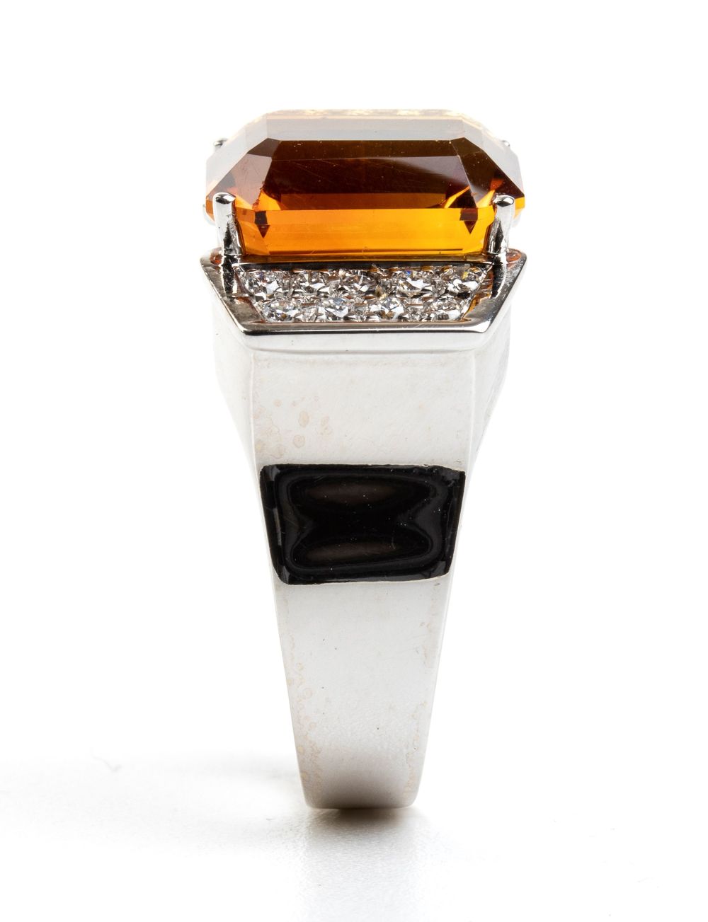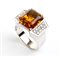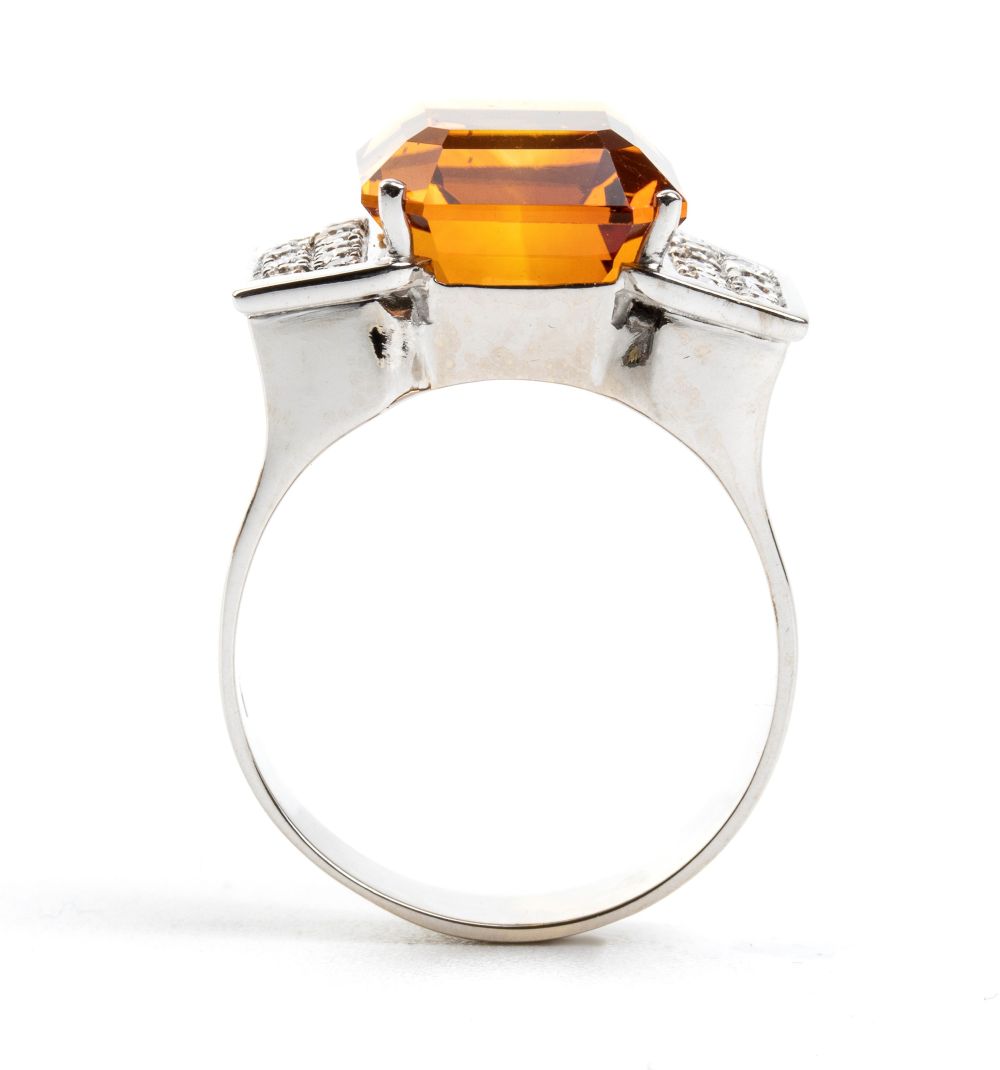 anello a fascia in oro bianco 18k, incastonato con quarzo citrino affiancato da pave' di diamanti. N. 18 diamanti di forma rotonda taglio brillante 0.25 ct, circa, F-G, IF-VVS. Punzonato "750".