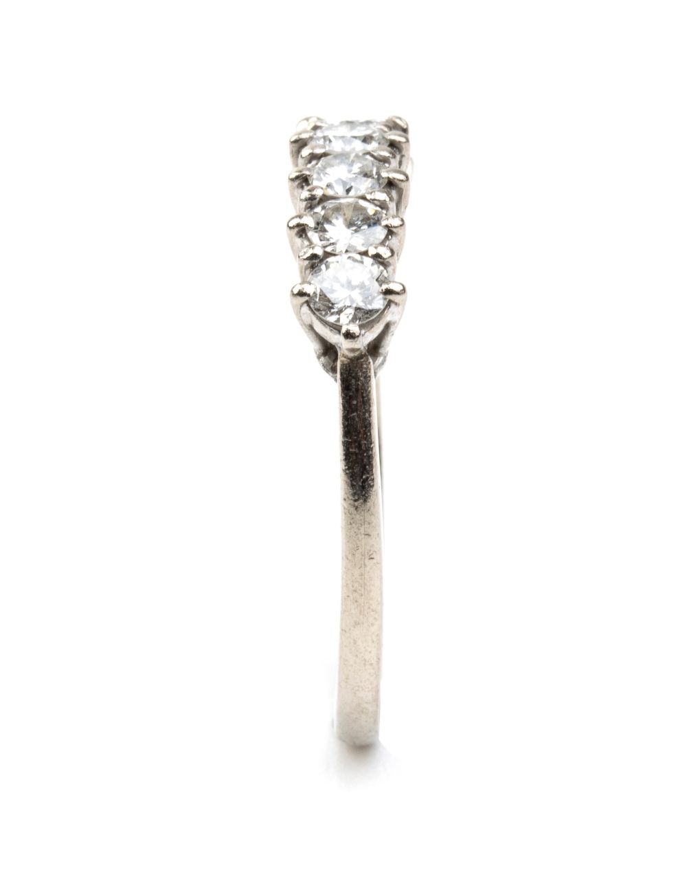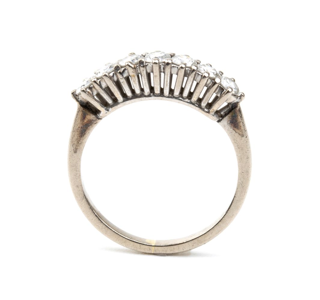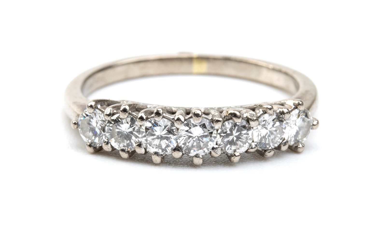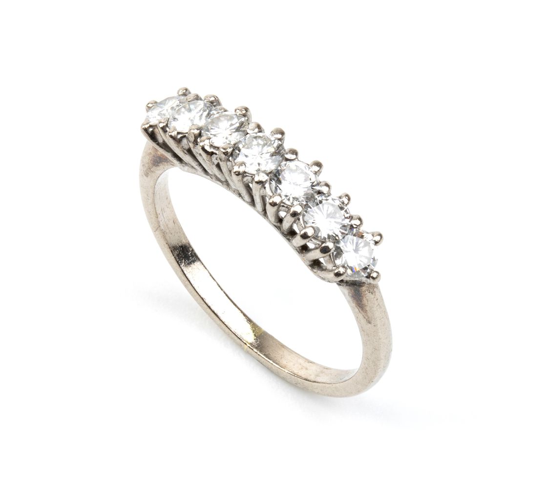 Anello in oro incastonato con linea di 7 diamanti. Diamanti di forma rotonda, taglio brillante, 0.80 ct circa, F - G , VVS.