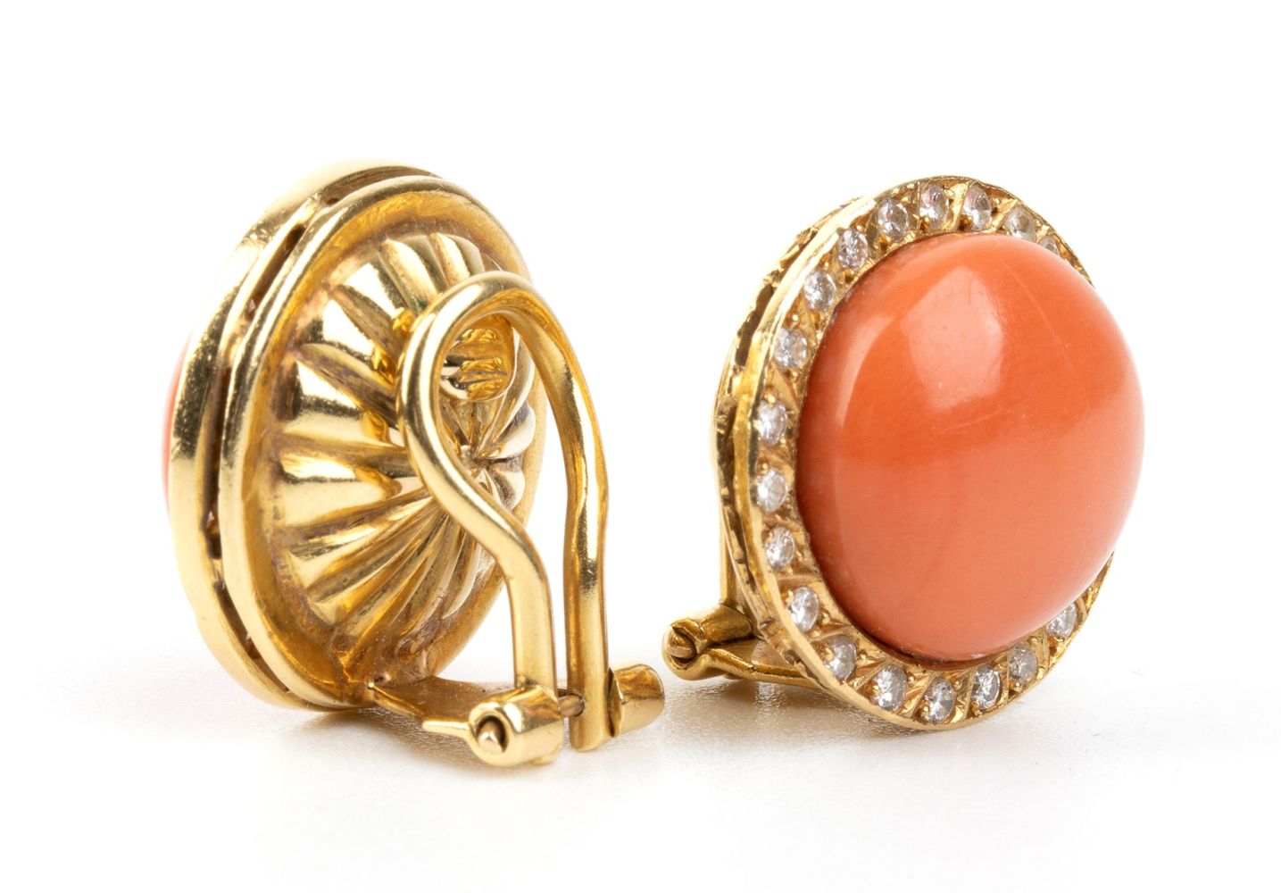 incastonati con cabochon di corallo cerasuolo (corallim elatius) incorniciato da diamanti. 42 diamanti di forma rotonda, taglio brillante, 0.60 ct circa, G - H, VVS.