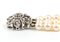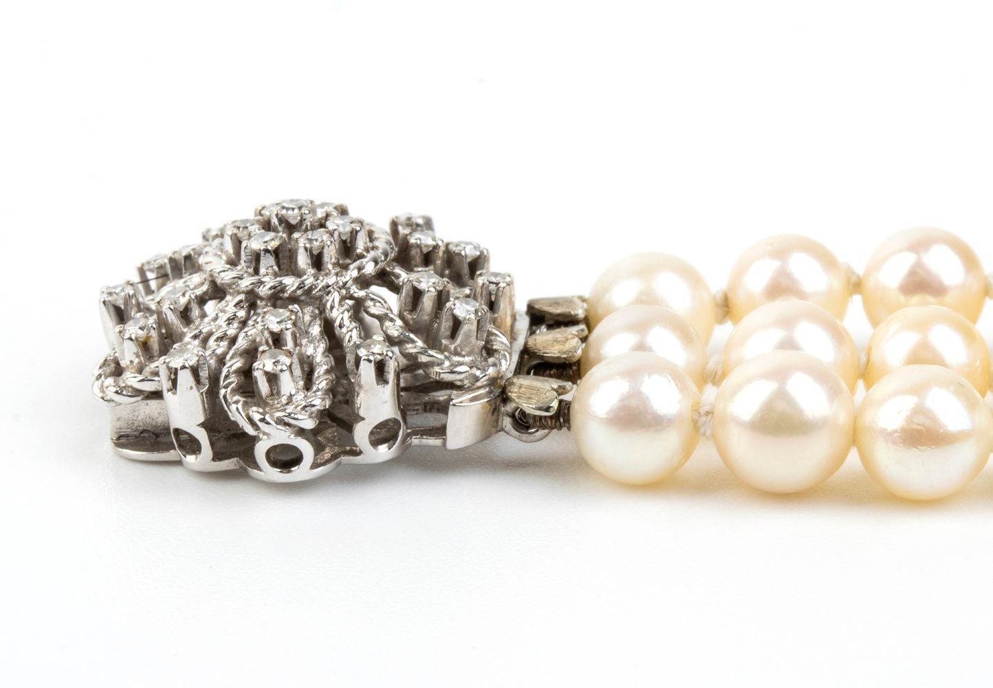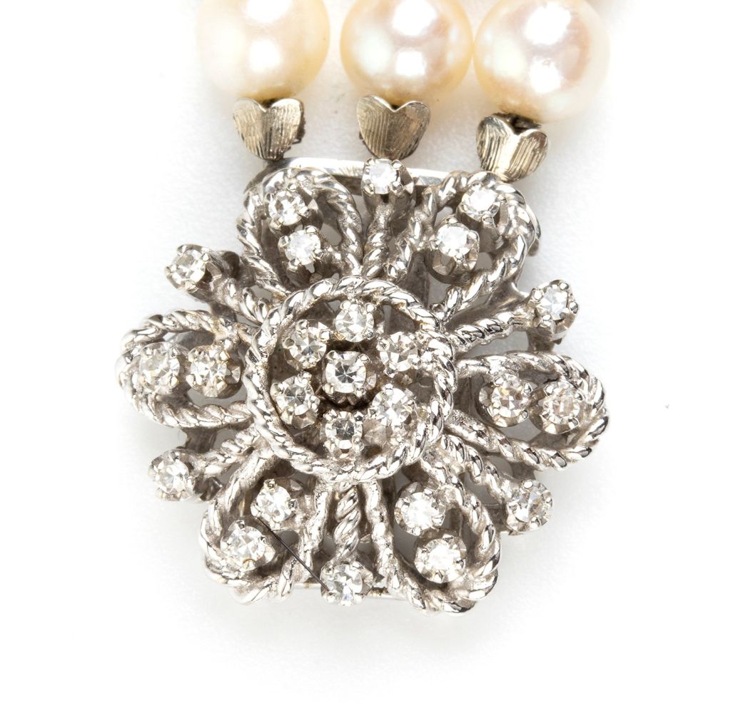 a tre fili di perle coltivate d'acqua salata con fermezza a rosone in oro bianco 18k, incastonata con diamanti. N. 25 diamanti di forma rotonda, taglio huit-huit, 0.75 ct circa, F-G , VVS-VS. Punzonata "750 - 288 AL".