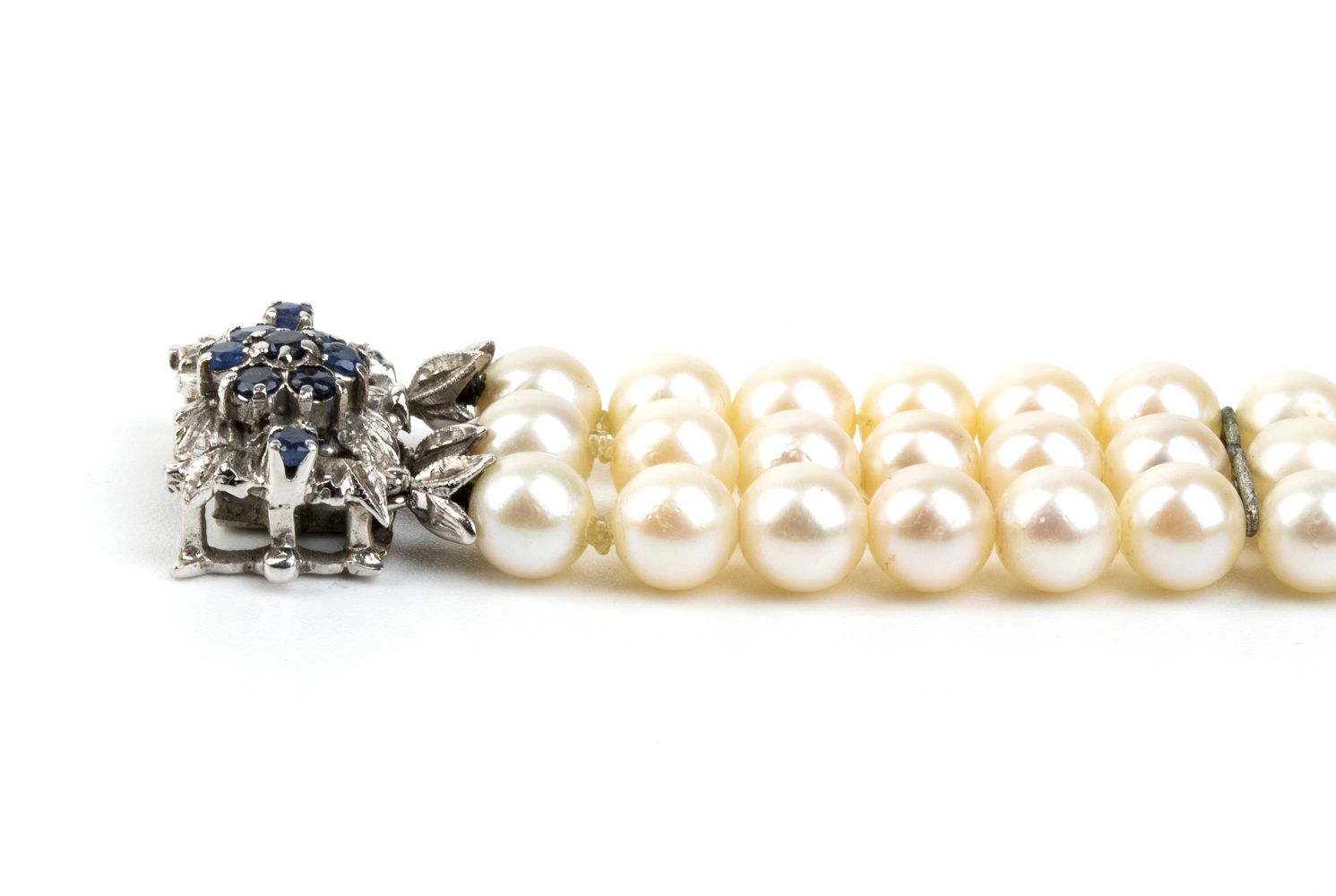 tre fili d perle coltivate d'acqua salata con fermezza floreale in oro bianco decorata con zaffiri.