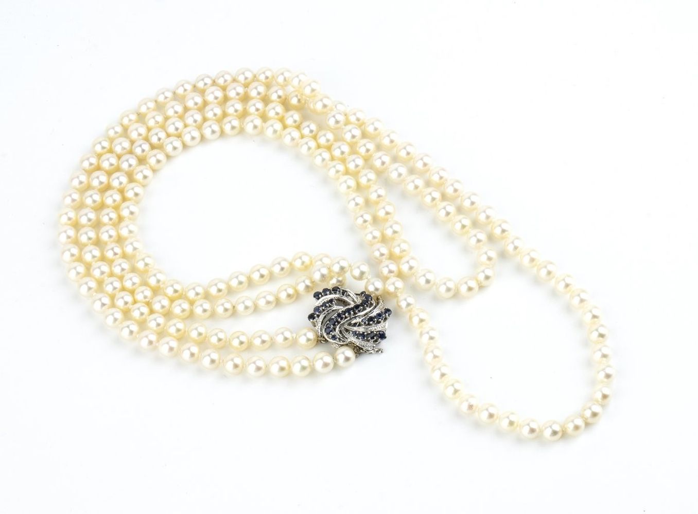 due fili di perle coltivate d'acqua salata con fermezza a motivo di girali in oro bianco 18k e zaffiri. N. 25 zaffiri di forma rotonda taglio composito 2.20 ct circa. Punzonato "750".