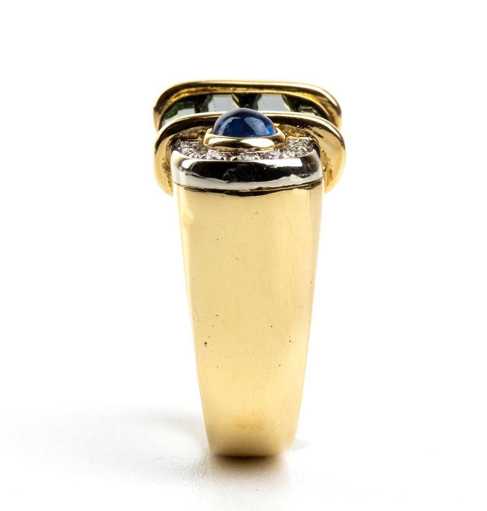oro giallo ed oro bianco, modellato come una fascia, incastonato con tormaline verdi, diamanti e cabochon di zaffiro. Punzonato "750 - 121 BO".