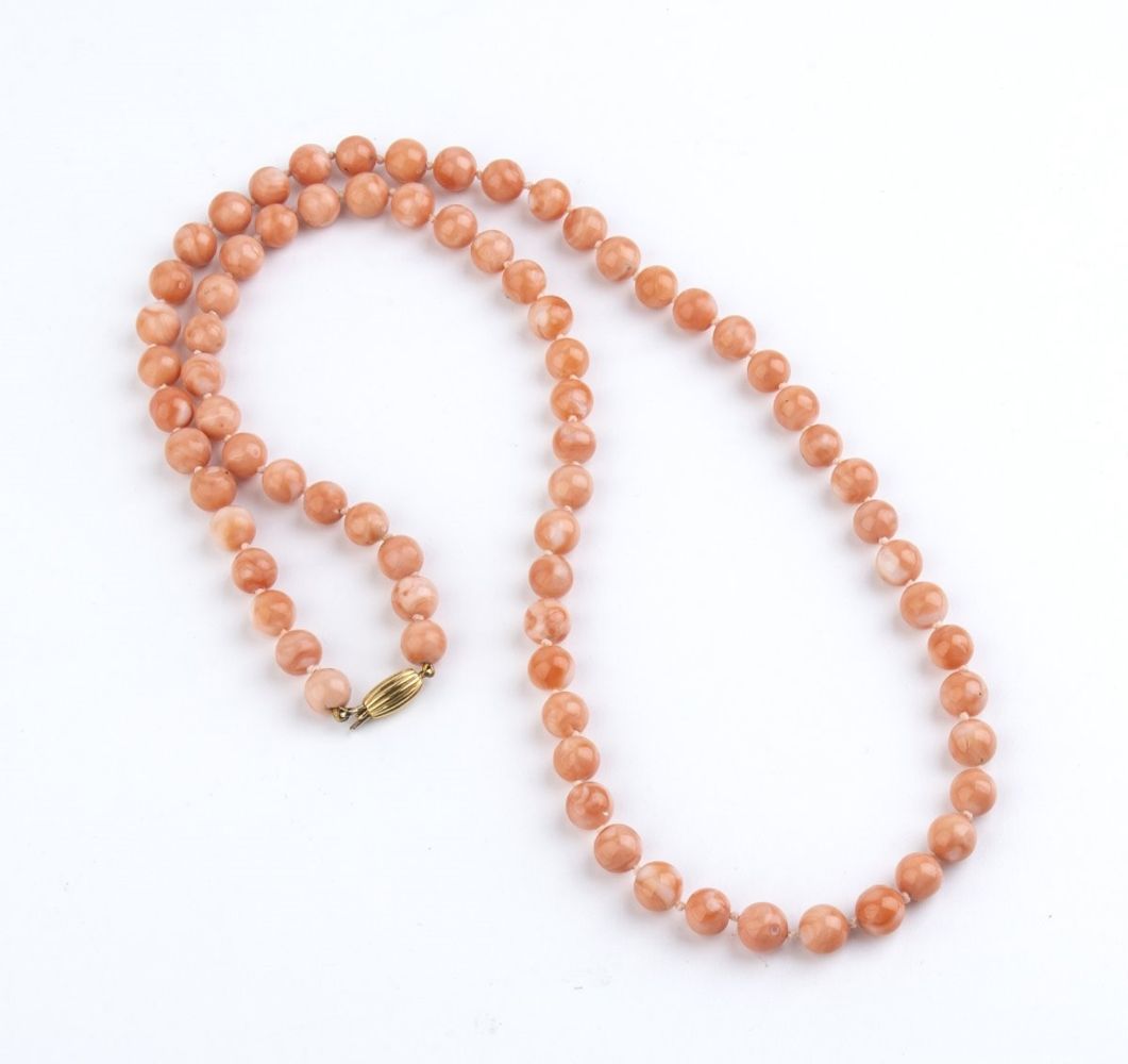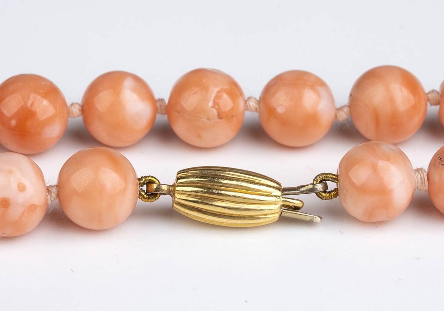 oro giallo 18k, ad un filo di sfere di corallo rosa (corallium regale). Punzonato "750 - 1043 AL".
