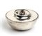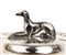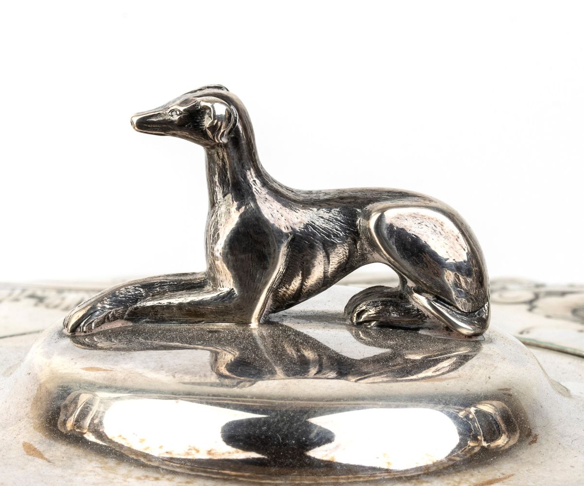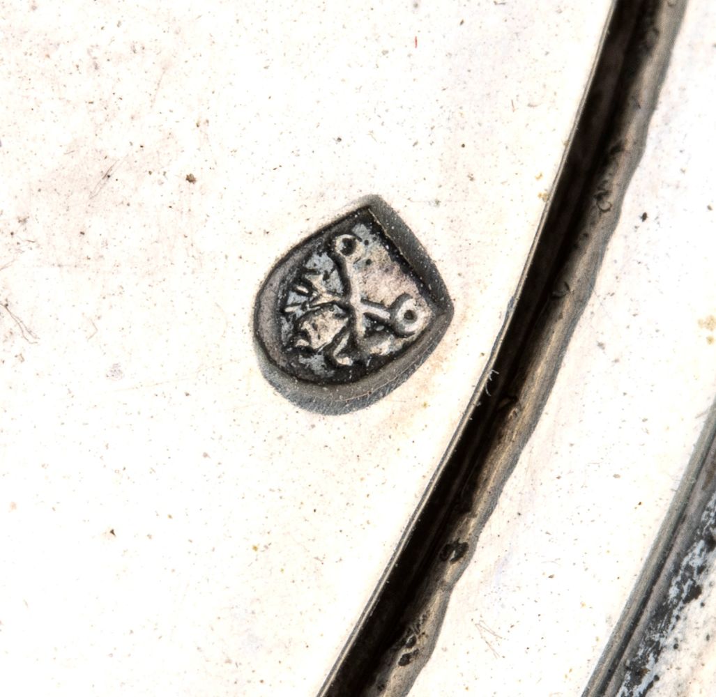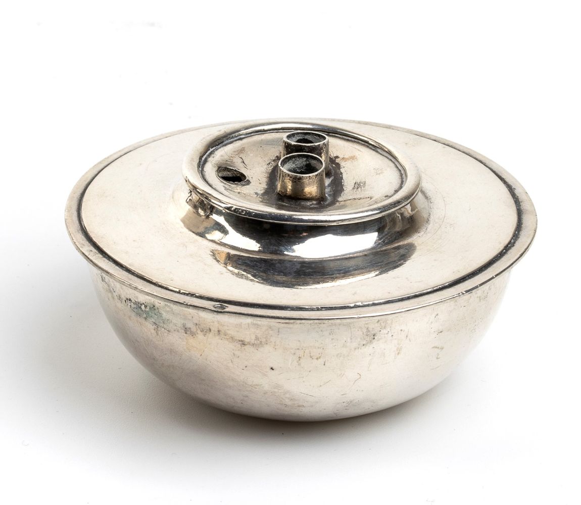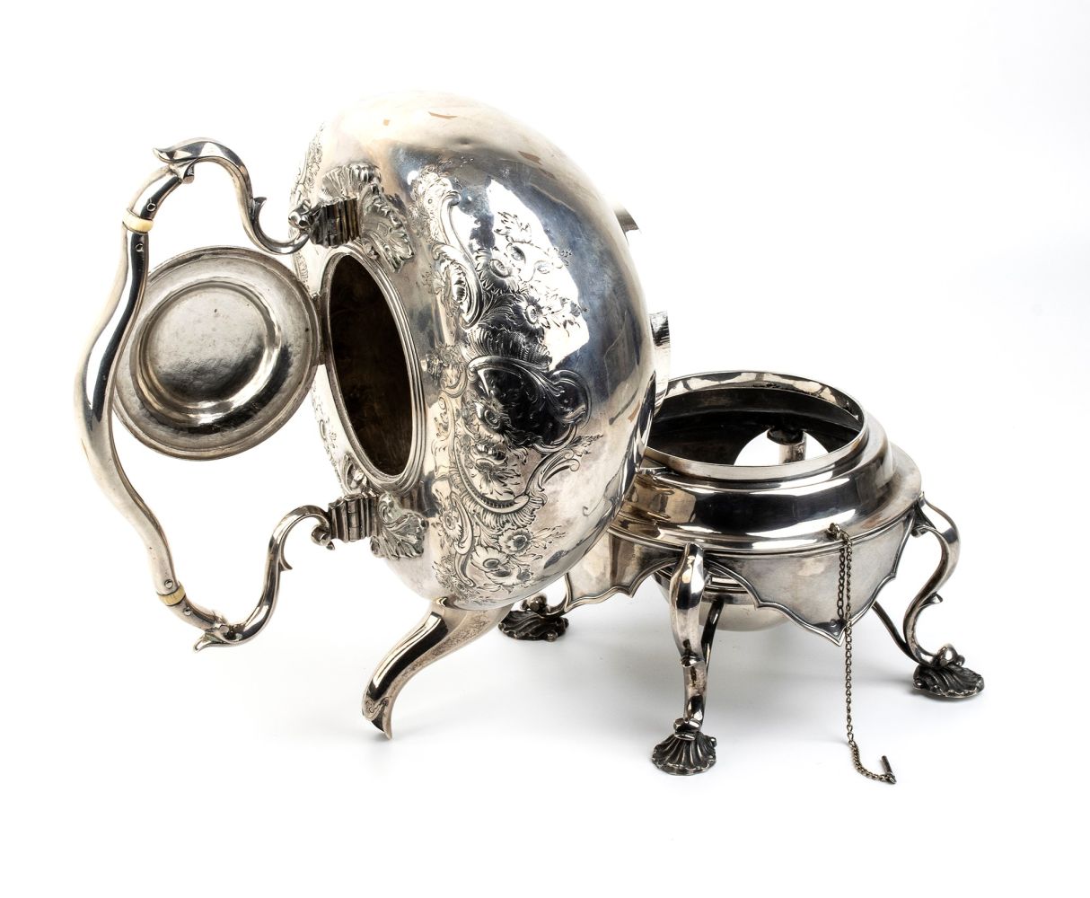 di forma globulare sbalzato e cesellato a motivi floreali, poggiante su basamento con fornelletto e piedini a foglia. Coperchio incernierato con presa a forma di levriero. Punzonato su tutti i pezzi con i marchi camerali in uso a Roma dopo il 1815 per l'argento al titolo di 10 once e 16 denari (889/1000) e con il marchio del rivenditore di New York Ball, Tompkins and Black (attivo nel 1839-51).