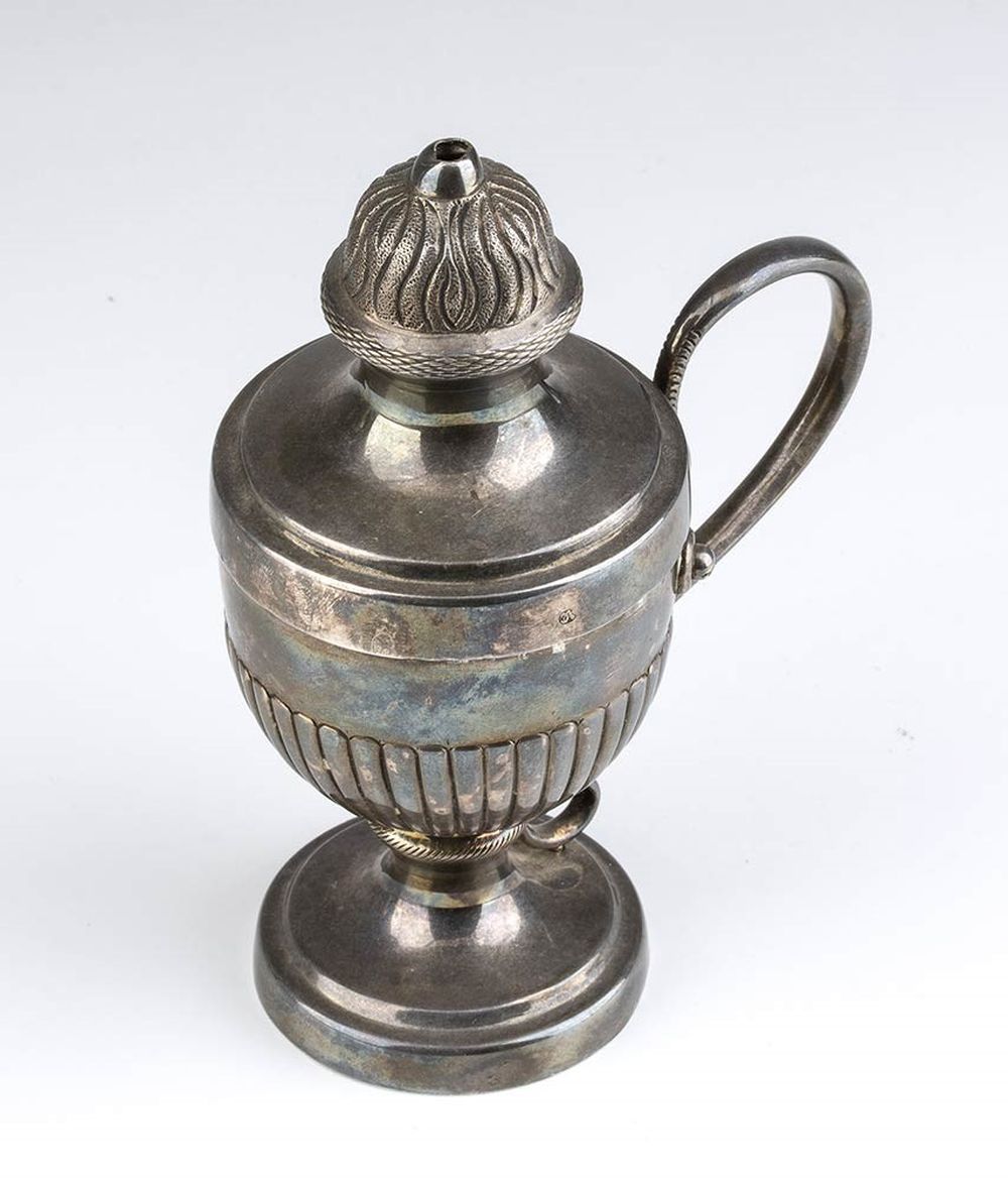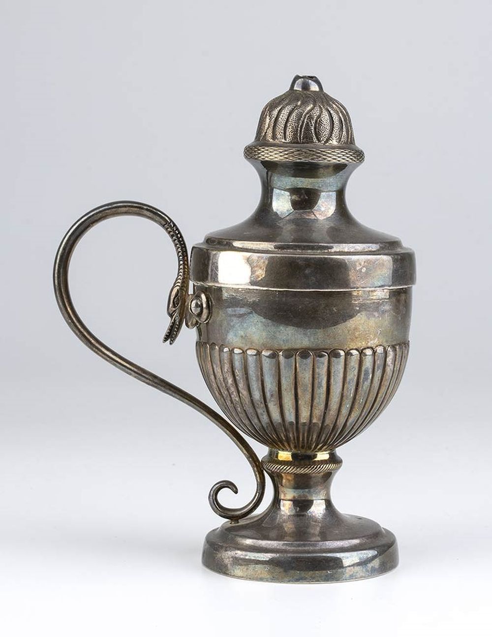 di forma circolare, manico con testa animale e coperchio ad innesto. Punzonata con i marchi camerali in uso a Roma alla fiine del XVIII secolo.