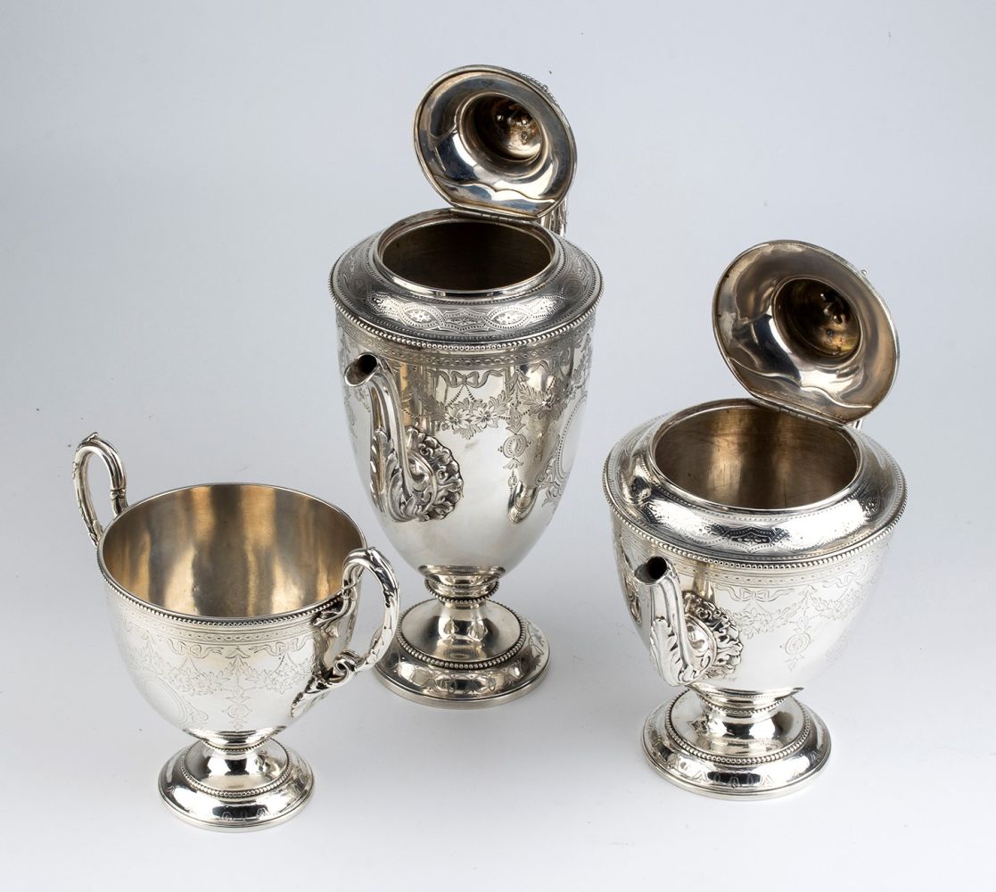 in stile neoclassico composto da una caffettiera , una teiera ed una zuccheriera poggianti su piede circolare con corpi incisi a taglio luce. Argento 925/1000, serie completa di marchi Londra 1869-1869, John, Edward, Walter & John Barnard (Barnard & Sons Ltd).