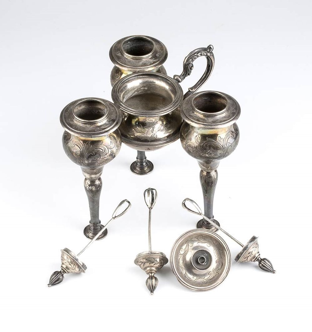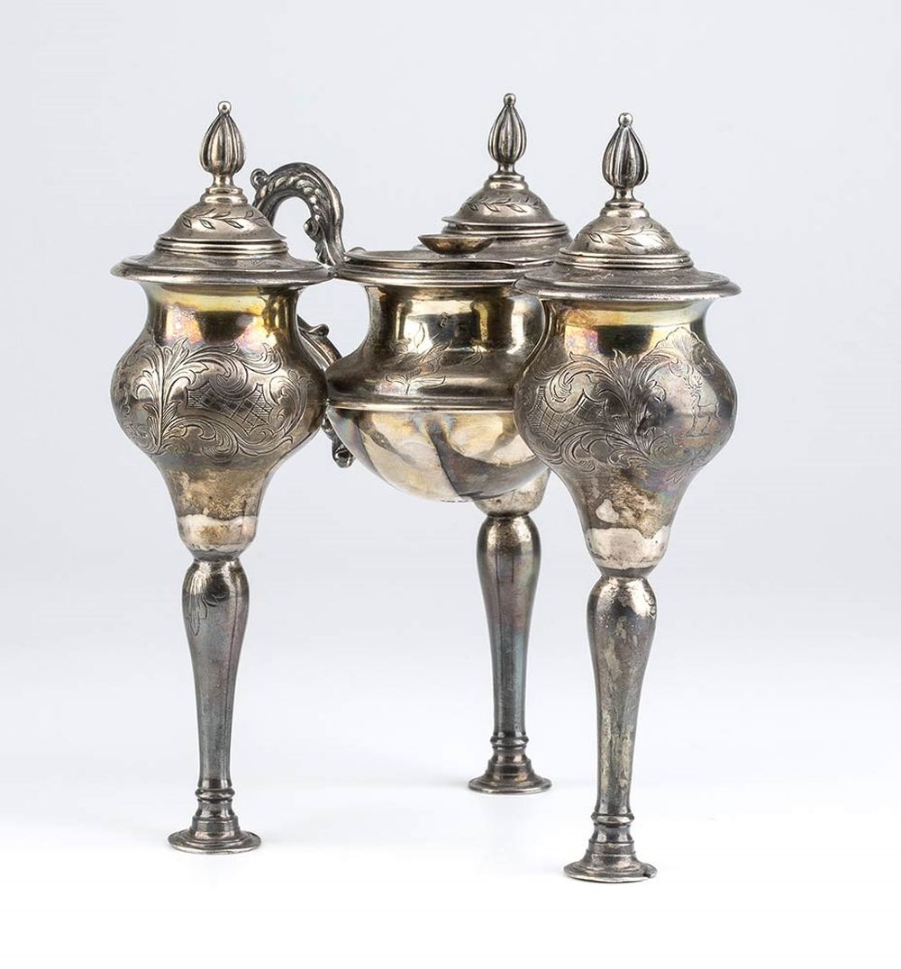 composta da tre contenitori laterali e uno centrale per lo stoppino, manico radiale. Argento 925/1000, serie completa di marchi Londra 1841-1842, maestro argentiere William Richards.
