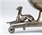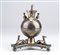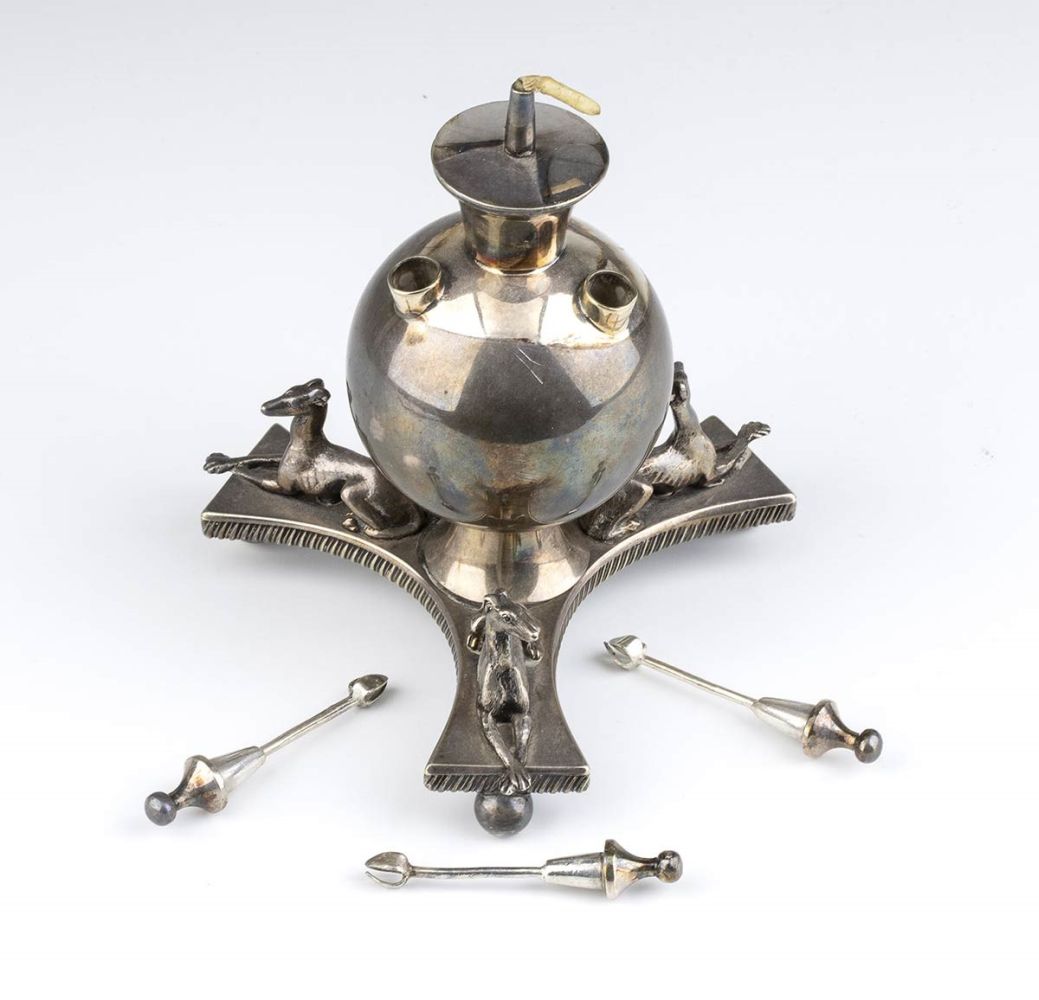 composta da una base dove poggiano le figure di tre cani con al centro un corpo sferico con al vertice lo stoppino. Metallo argentato (E.P.N.S. Electro plated nickel silver),Birmingham 1899, argentiere Elkington & Co.
