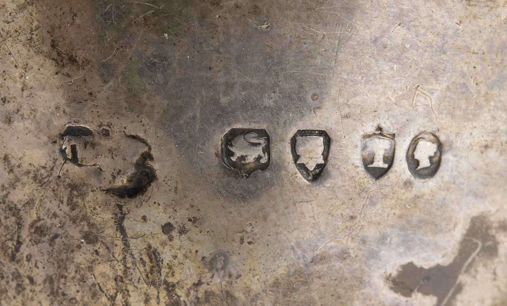 di forma circolare con due manici laterali. Argento 925/1000, serie completa di marchi Londra 1884-1885.