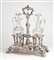 base sagomata con decorazione a volute fogliate e due bottiglie in vetro molato. Argento 950/1000, serie completa di marchi Parigi in uso dopo il 1838, argentiere M. RAY a Paris. Dimensioni 35,5 x 29 x 14,50 cm. Peso complessivo 2237 gr, peso argento 841 gr.
