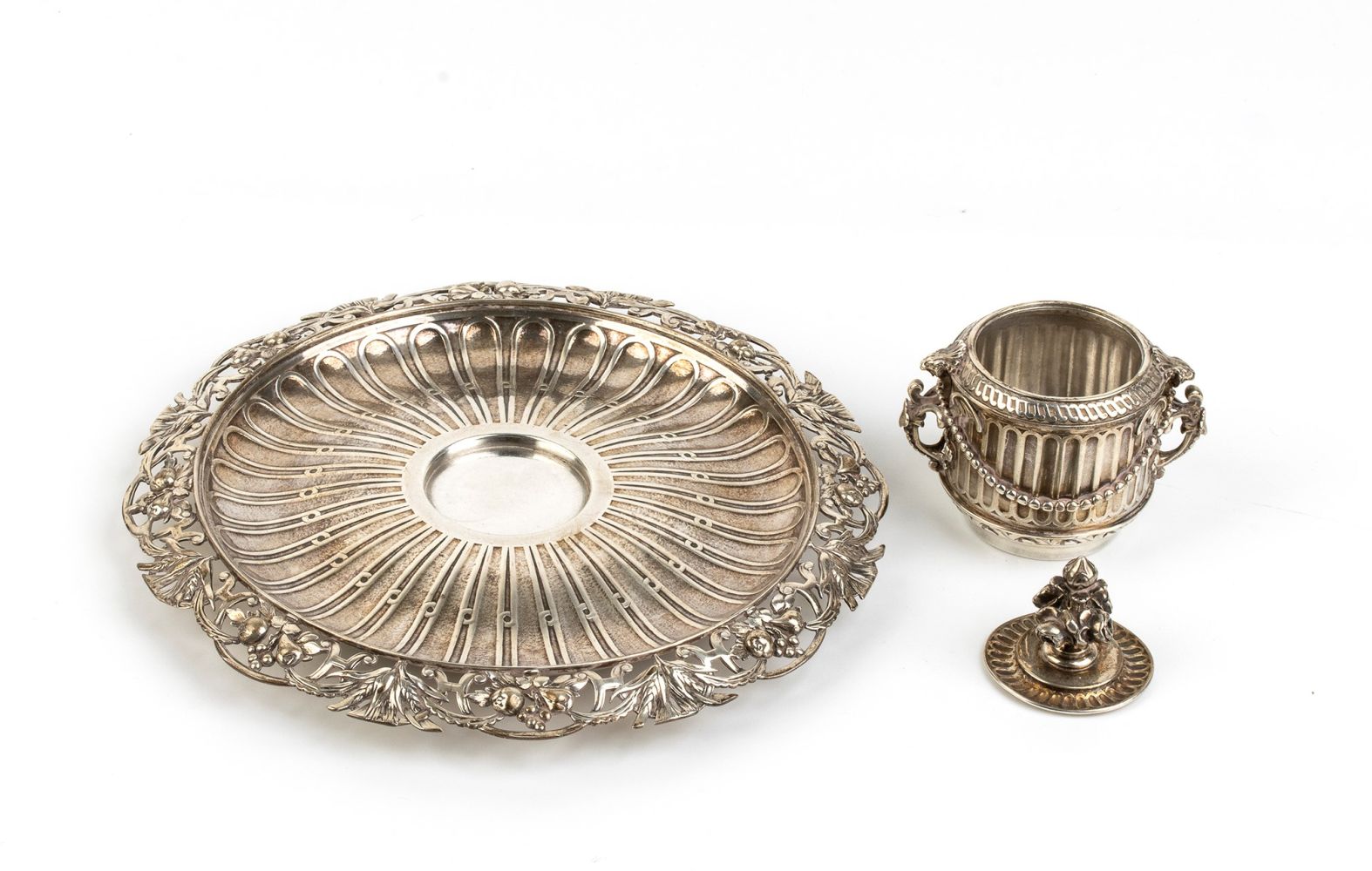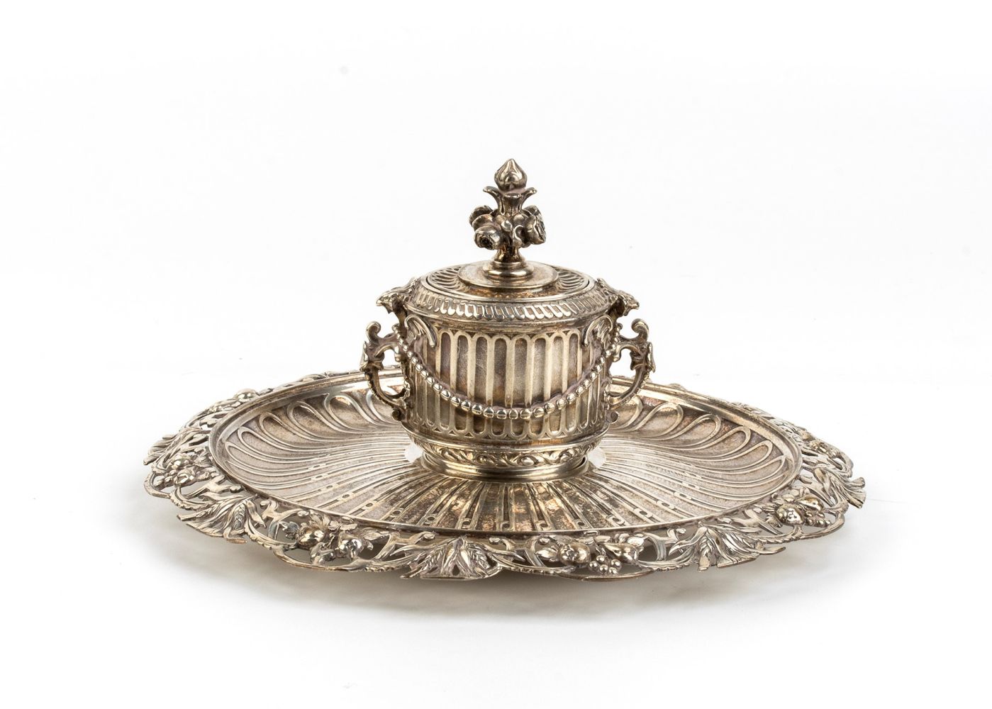 di forma circolare con costolature radiali e bordo a decori vegetali; il portainchiostro biansato, decorato similarmente al piatto, presenta un coperchio con cimatura floreale. Punzonato con marchi francesi post 1838 in uso a Parigi per l'argento 950/1000, marchio argentiere " J W e due stelle".