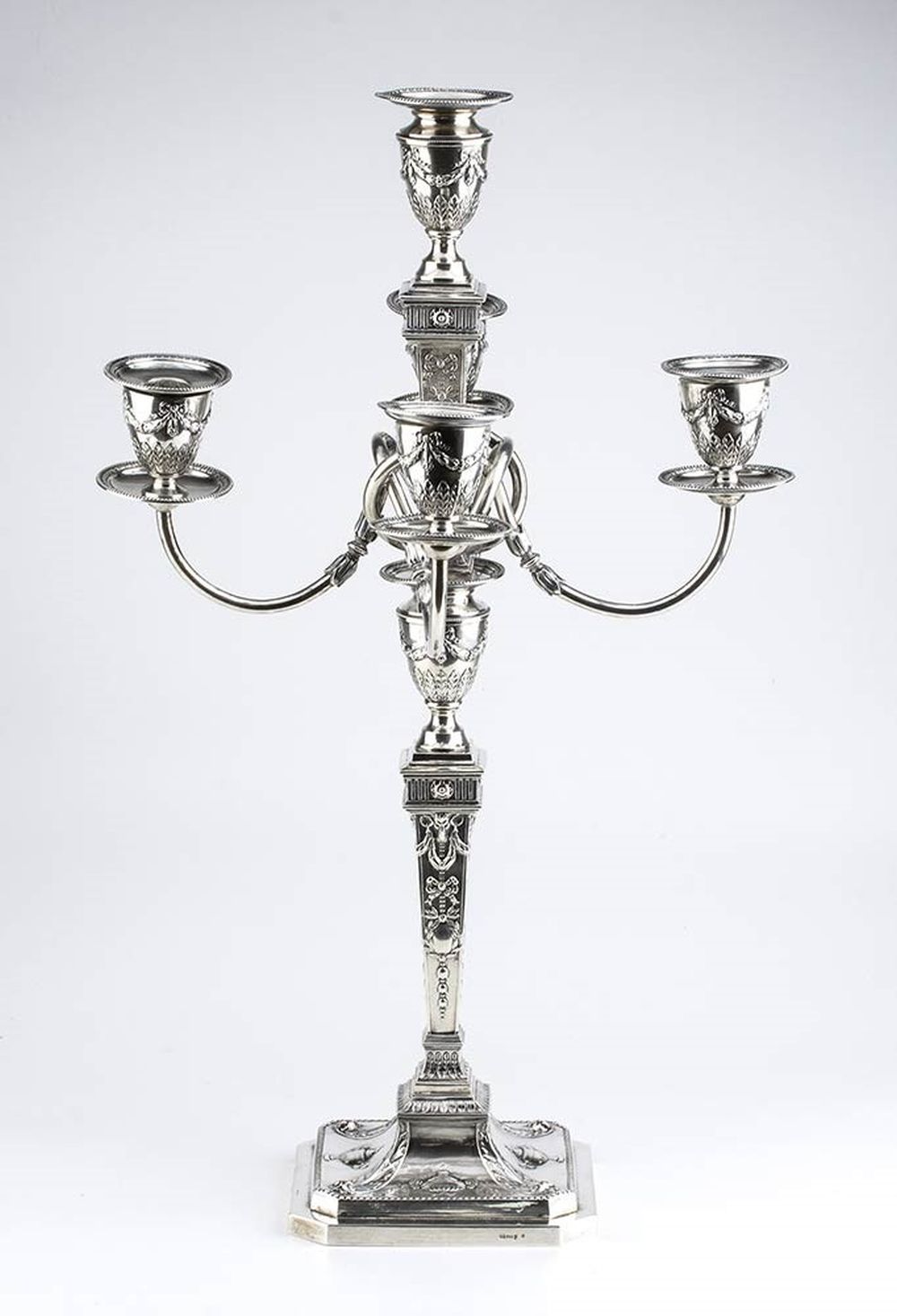 decorato in stile Adam, con base quadrata gradinata con angoli smussati e parte superiore a cinque fiamme con braccia intrecciate, piattini salva cera removibili. Argento 800/1000, punzonato con i marchi in uso in Germania dopo il 1888.