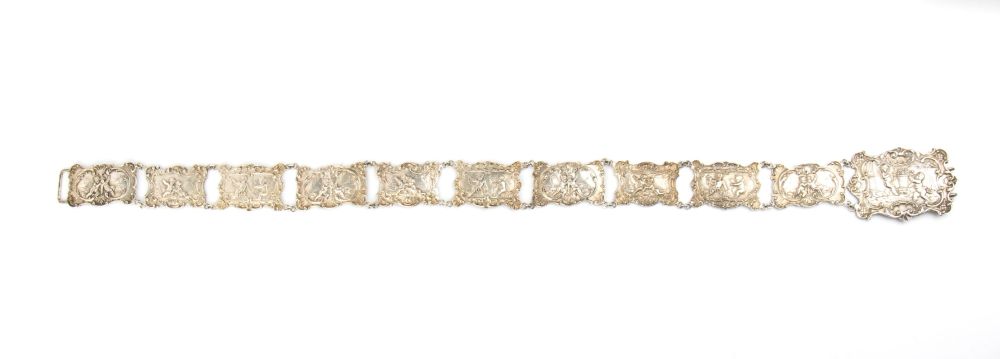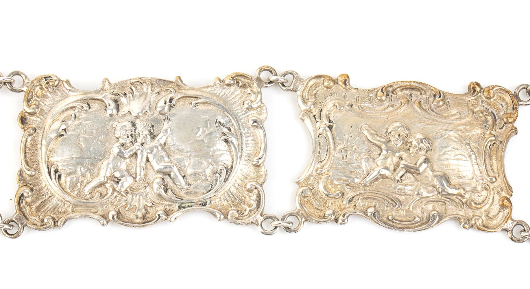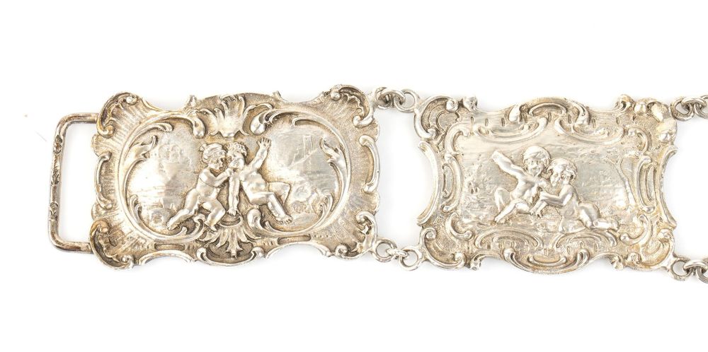 composta da 11 placche in argento fuso e cesellato rafffiguranti putti festanti. Punzonata con marchi non identificati, probabilmente di area tedesca.