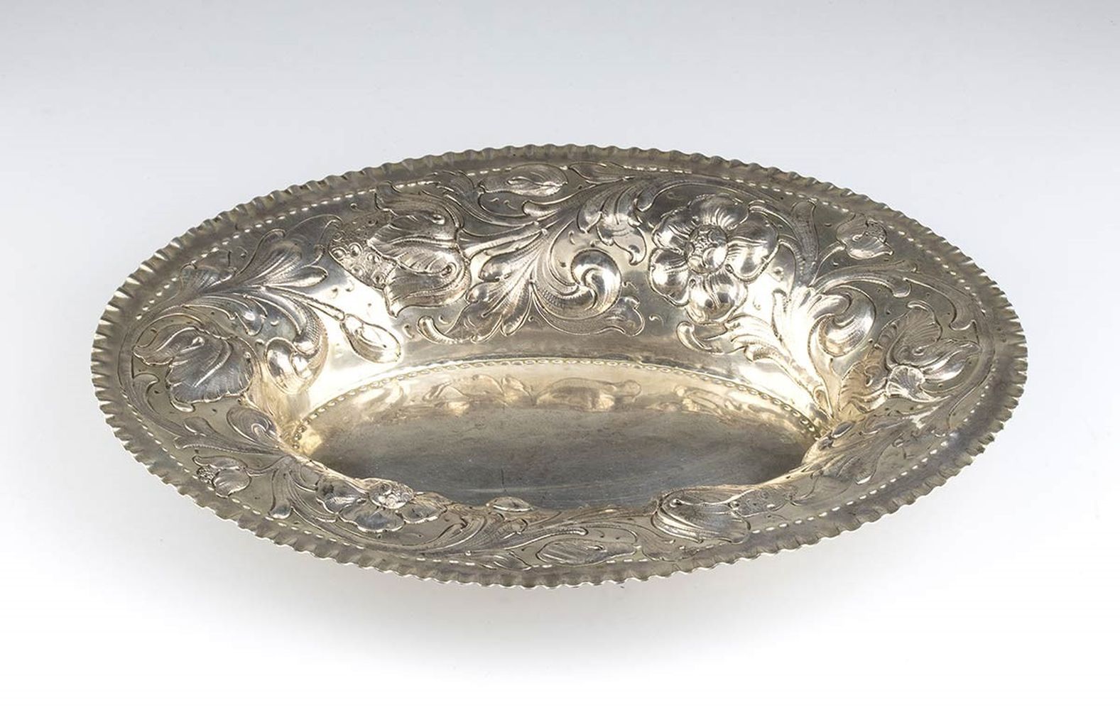 di forma ovale, interamente sbalzato e cesellato con fiori foglie. Argento 800/1000, punzonato con i marchi in uso a Stoccolma nel 1912 (K7), argentiere Gustav Mollenberg (C.G. Hallbergs Guldsmeds AB). C.G. Hallberg was a prominent Swedish goldsmiths and jewelers, jeweler to the Swedish Court.