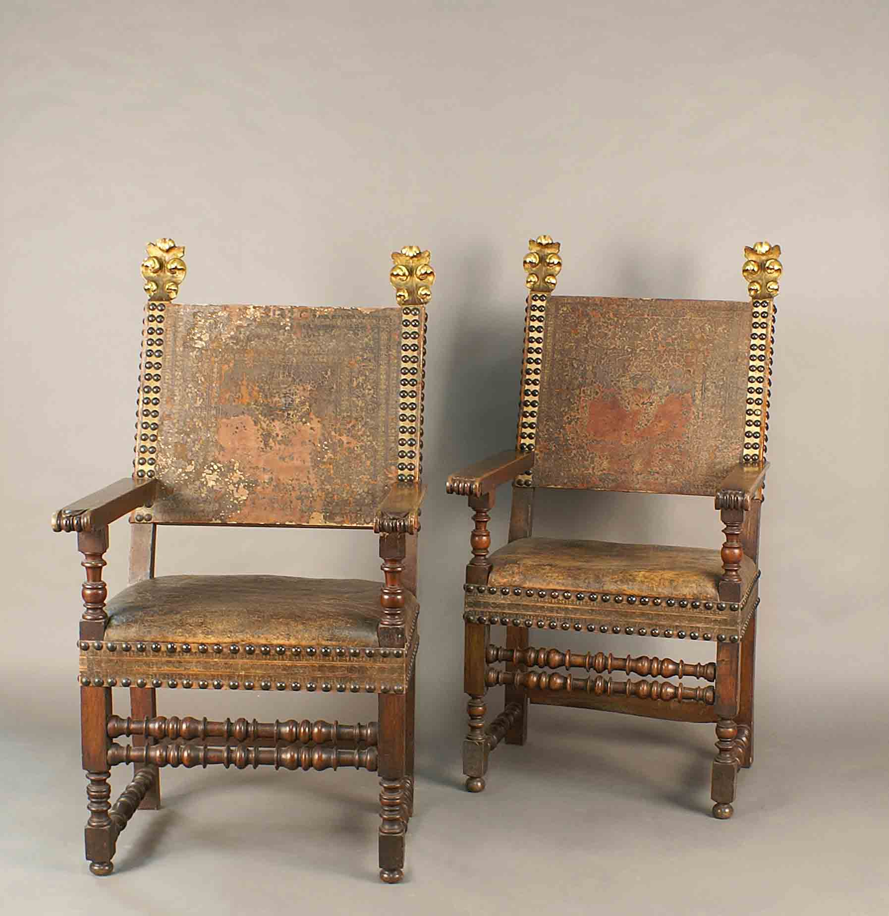 Coppia di seggioloni da parata in noce, schienali e sedute rivestite in cuoio poggianti su gambe tornite, XVIII secolo, h. cm. 129 (difetti).