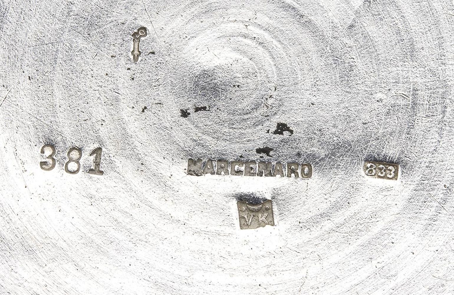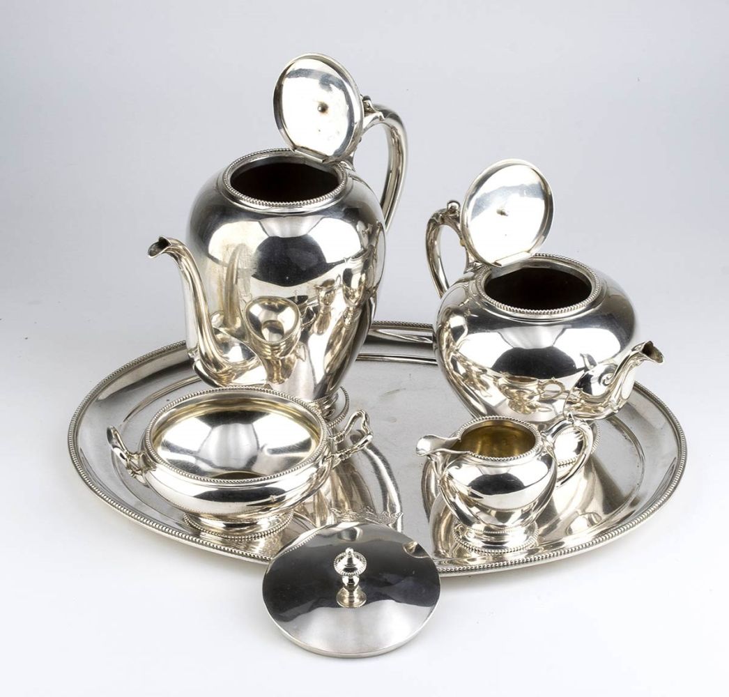 composto da vassoio ovale, caffettiera, teiera, zuccheriera e bricco da latte, con corpo liscio e perlinature perimetrali. Argento 833/1000, marchi olandesi per l'argento al titolo di 833/1000 e marchi di esportazione, argentiere o rivenditore Marcenaro.