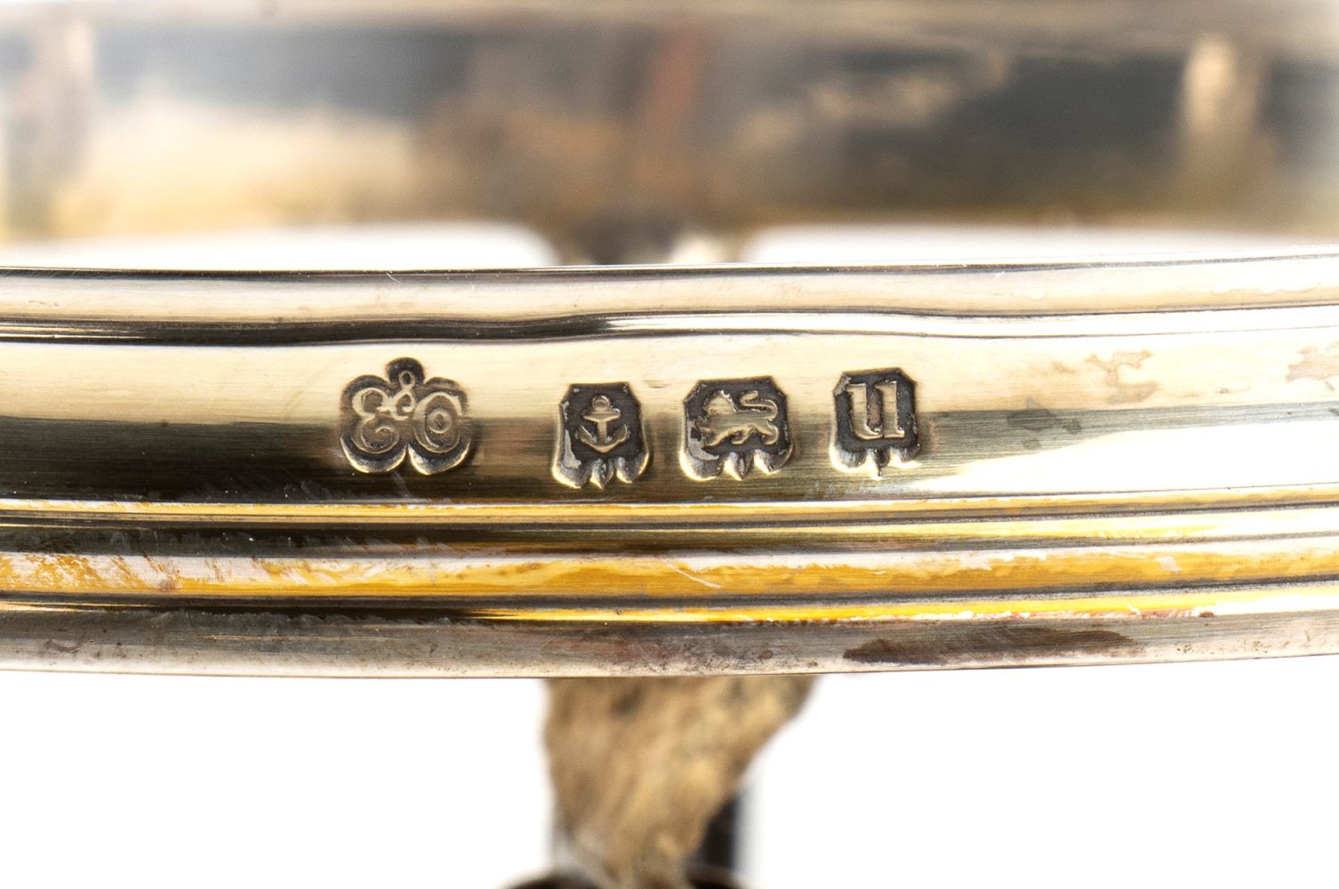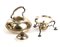 di forma circolare con corpo liscio e fornelletto inferiore, poggiante su tre piedini a foglia. Argento 925/1000, serie completa di marchi Birmingham 1919-1920, argentiere Elkington & Co Ltd.