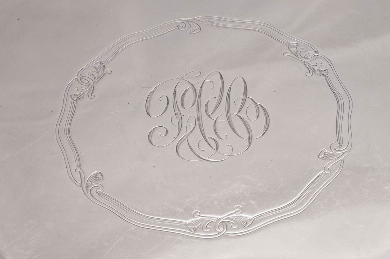 di forma sagomata, decorato con volute fogliate perimetrali, poggiante su quattro piedini ad artiglio. Argento 925/000, serie completa di marchi Sheffield 1905-1906, argentieri Robert & Belk.