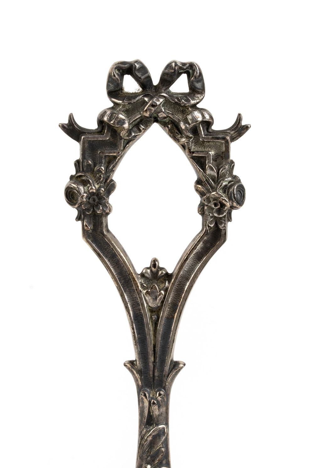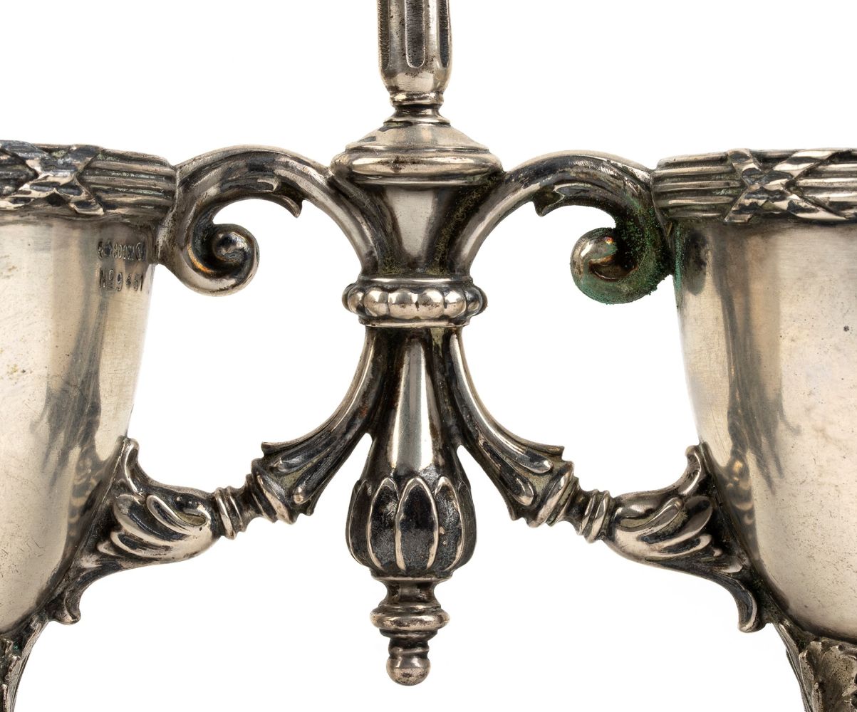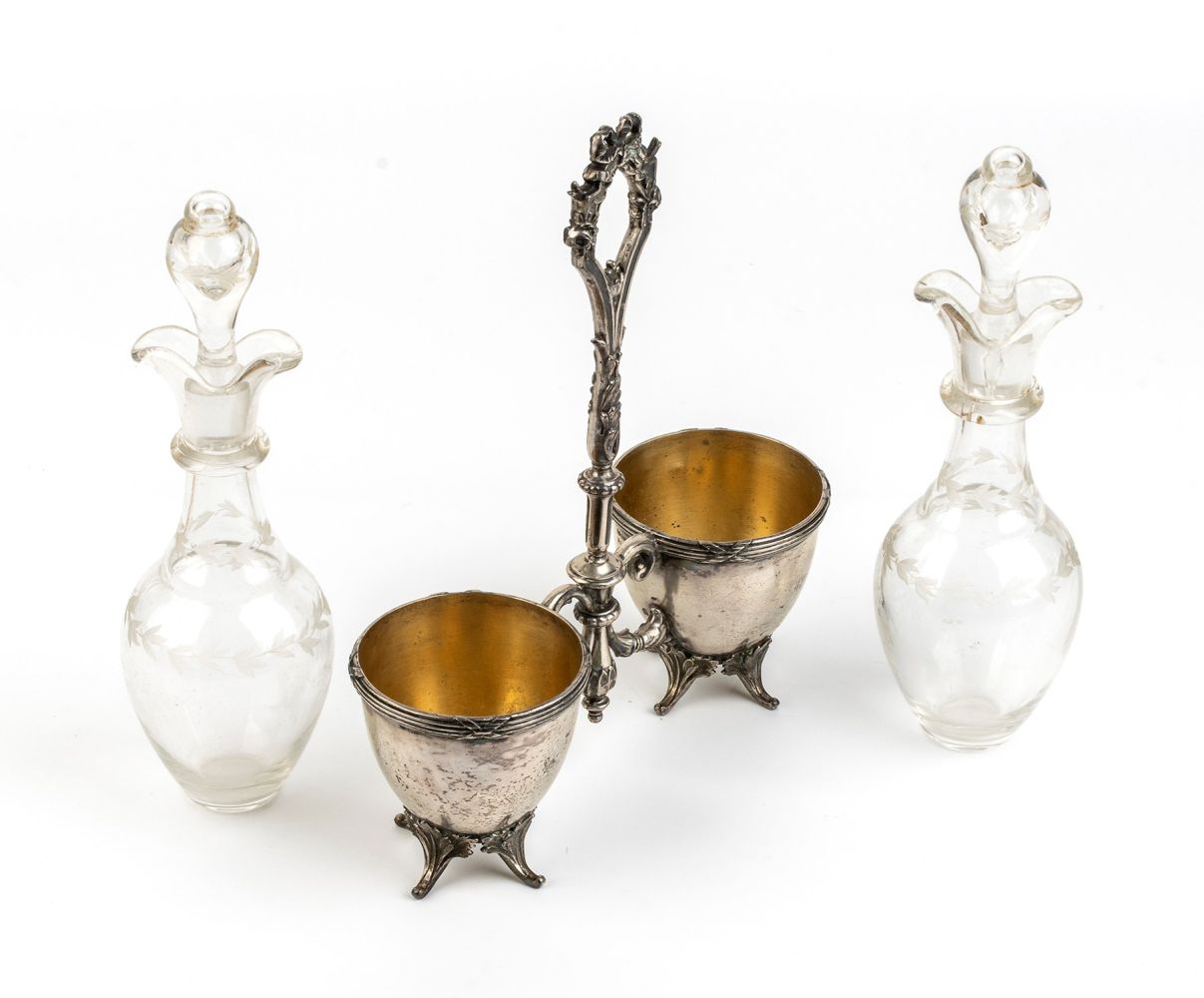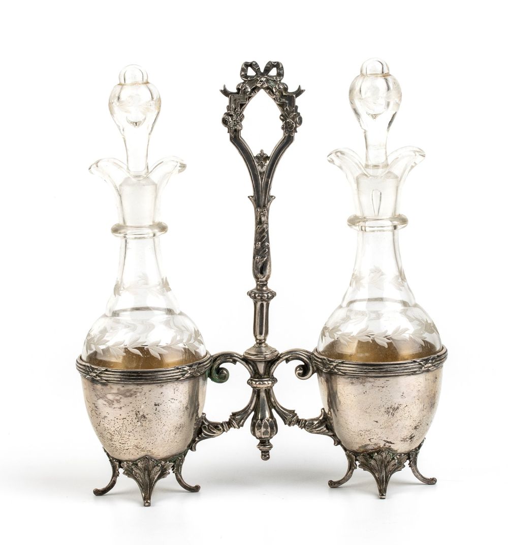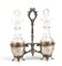con presa centrale e due ampolle laterali in vetro. Argento 800/1000, punzonata con i marchi in uso in Germania dopo il 1888.