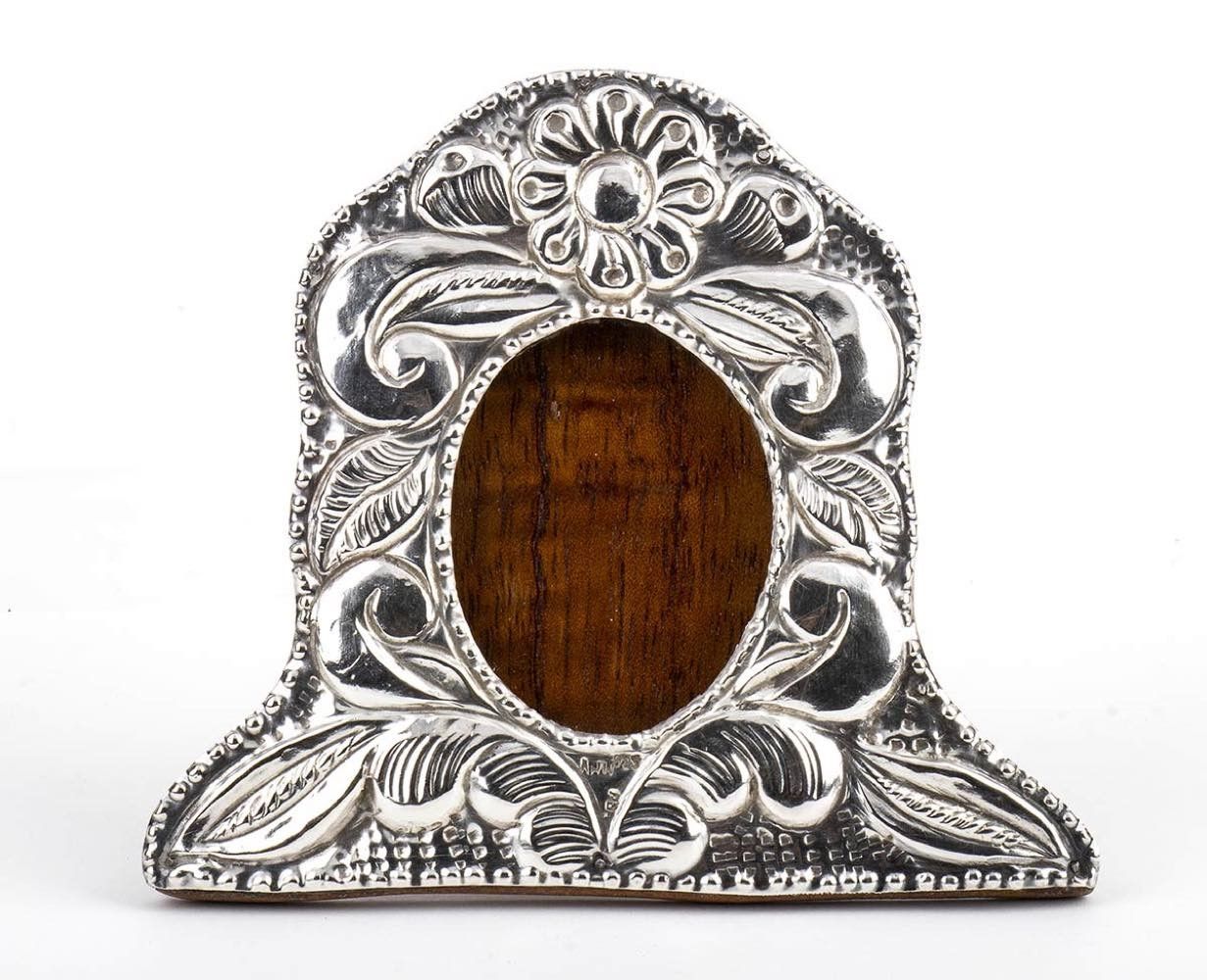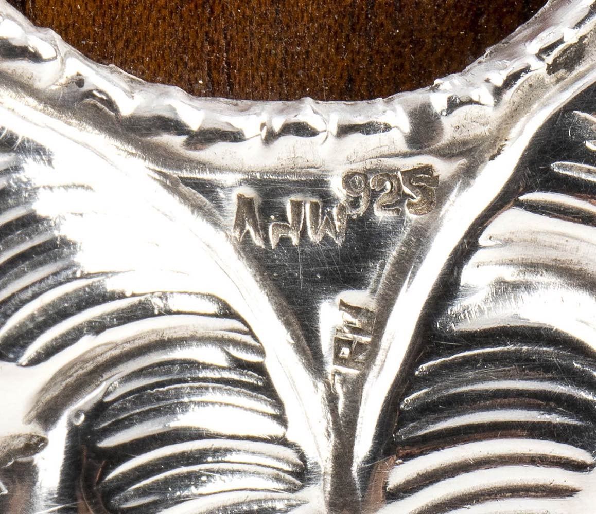 sbalzata e cesellata con decori floreali. Argento 925/1000 su supporto ligneo, punzonata "RM - MPV - 925".