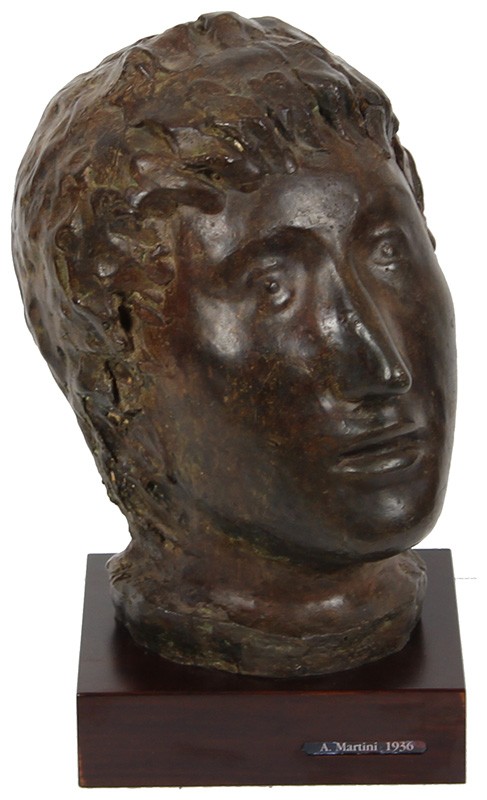 Martini Arturo Testa di giovane Scultura in bronzo, cm. h. cm. 35, es. 7/9 si tratta di una fusione postuma in bronzo realizzata dall'originale in gesso di Arturo Martini (1936) su autorizzazione della sig.ra Martini. La "Testa di giovane" del 1936 è stata realizzata come studio di uno dei personaggi della importante scultura "La giustizia corporativa" collocata nel 1937 al Palazzo di Giustizia di Milano