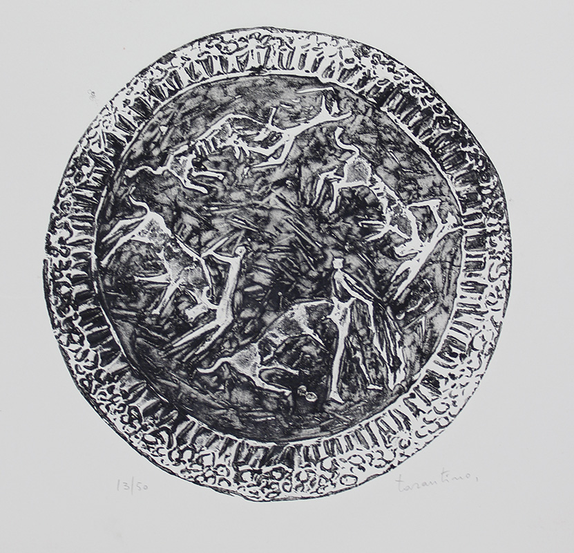 Tarantino Giuseppe Battaglia acquaforte su carta a rilievo, cm. 50x35, es. 13/50 firmata in basso a destra, etichetta Galleria Viotti Torino al retro