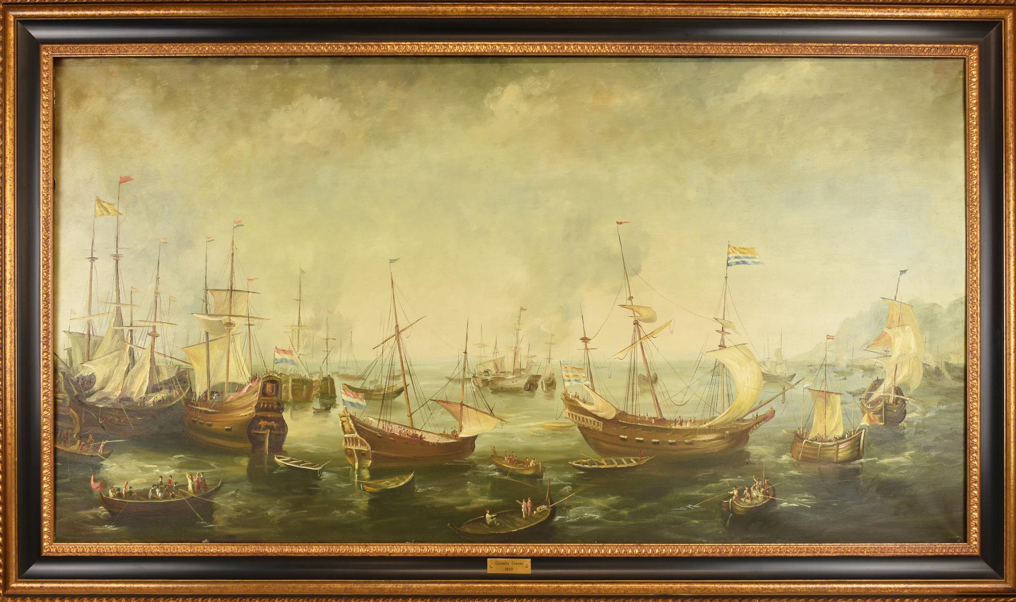 Da Cornelis Claesz BATTAGLIA NAVALE copia dall'antico su tela, cm 70x140...
