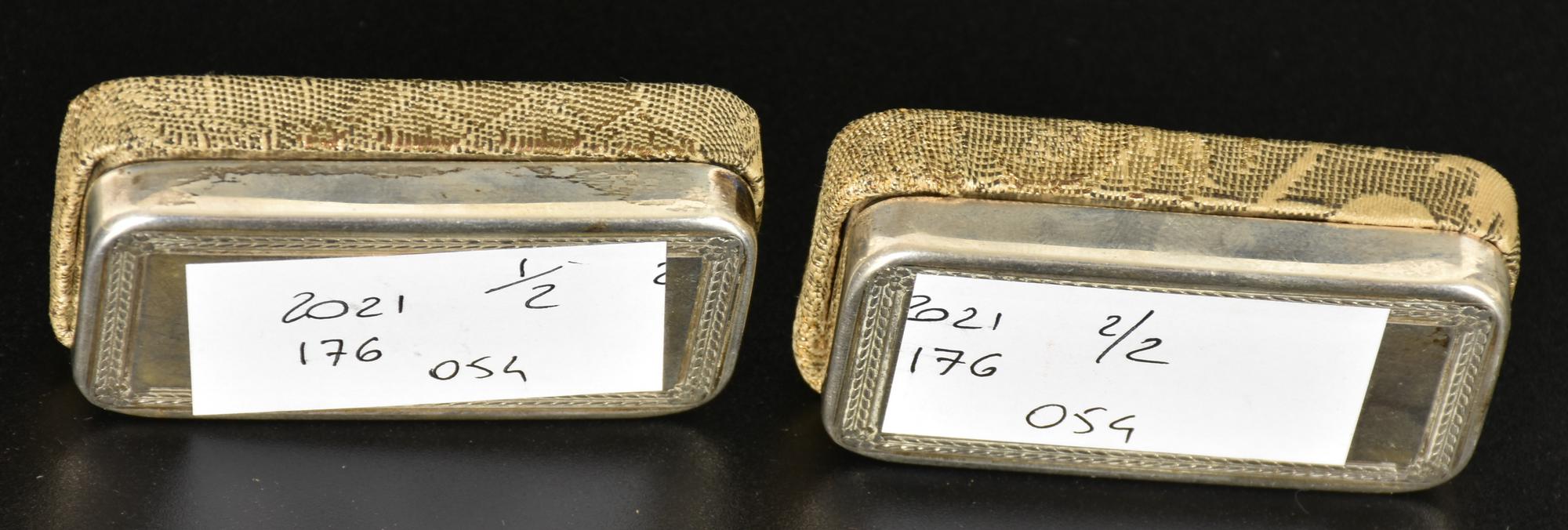 COPPIA DI SNUFF BOX in metallo argentato con coperchio rivestito di stoffa...