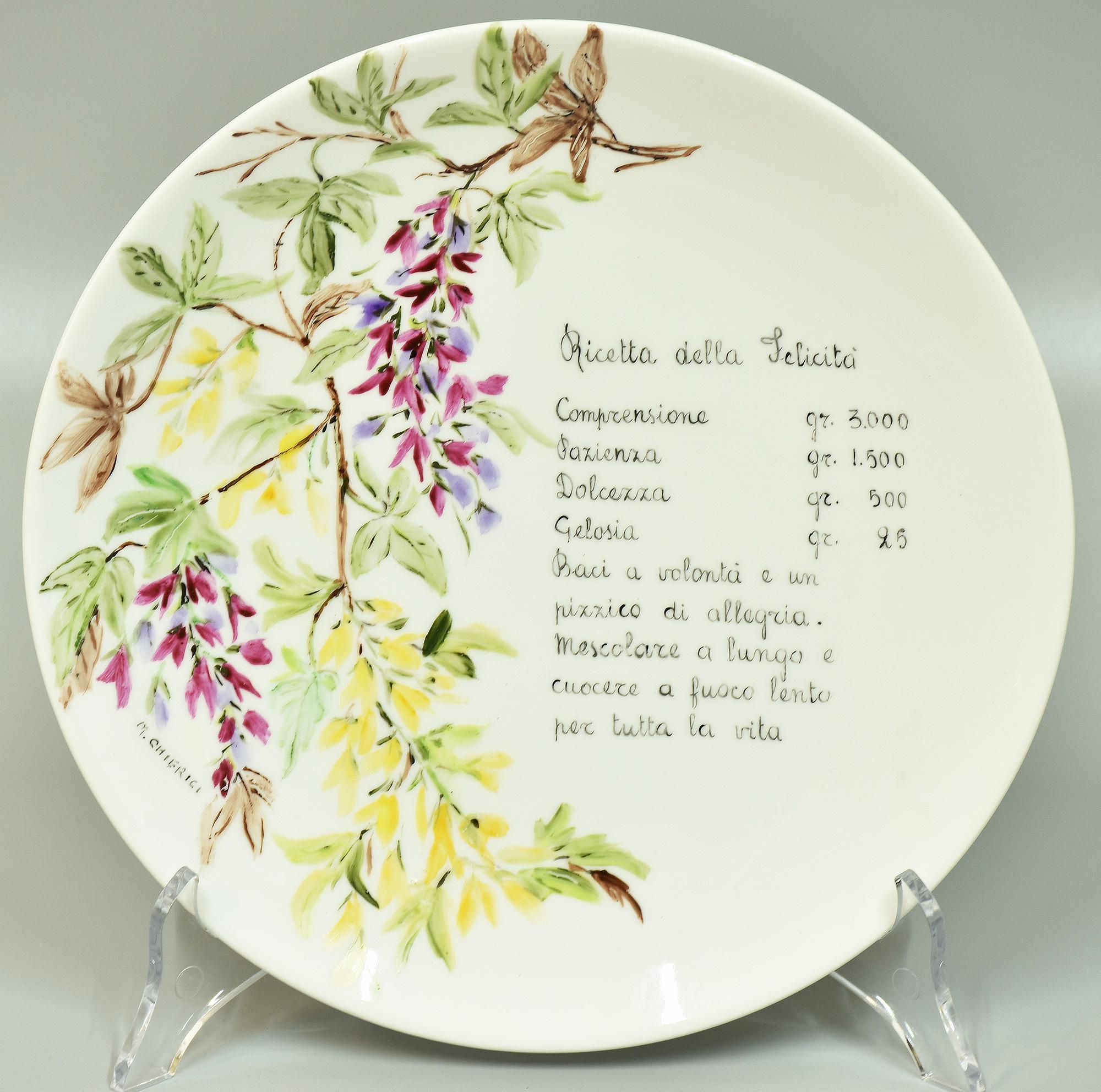 piatto in ceramica decorato con fiori e recante la ricetta della felicita', firmato. R. Chierici