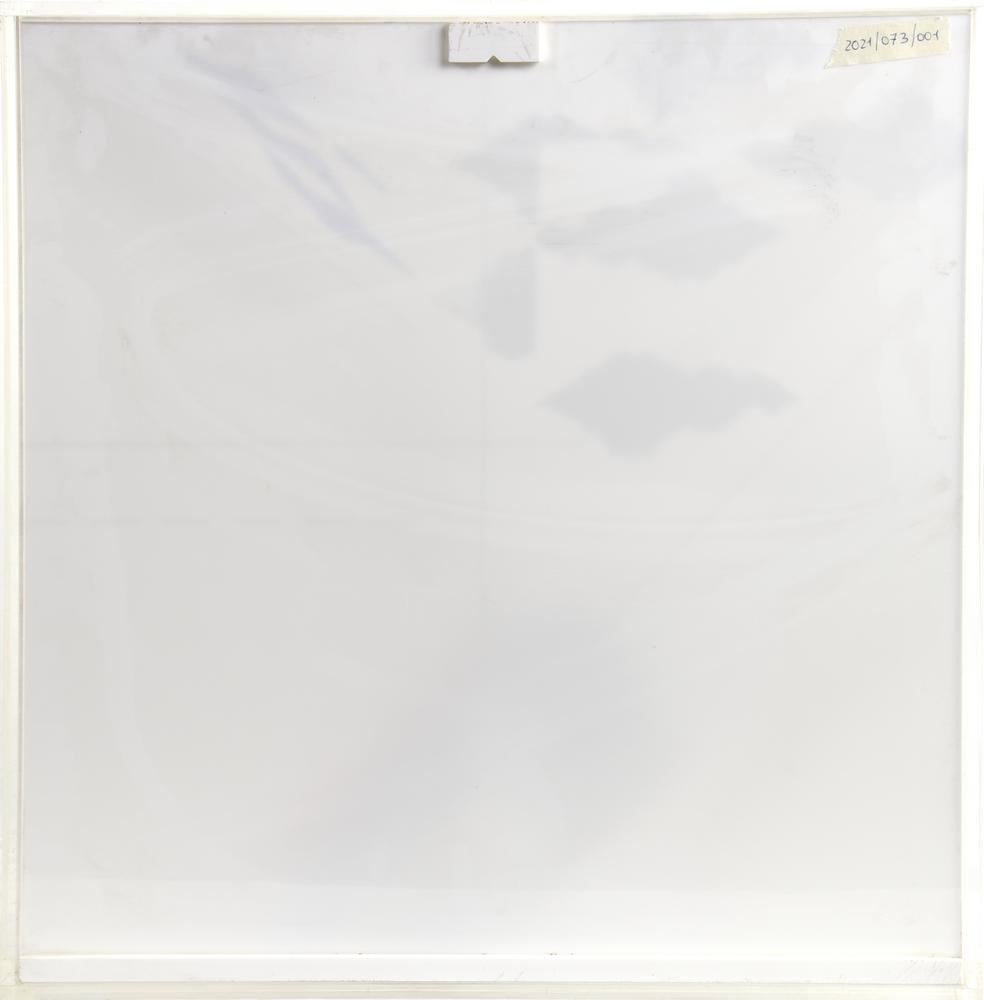 multiplo in plexiglass multistrato a quattro livelli serigrafati e collage, cm 52x49,5x7,8; es. 64/99