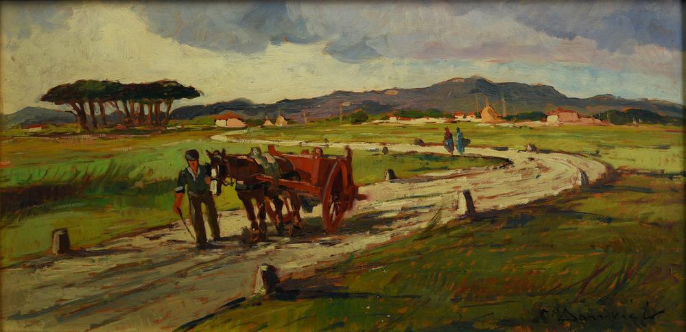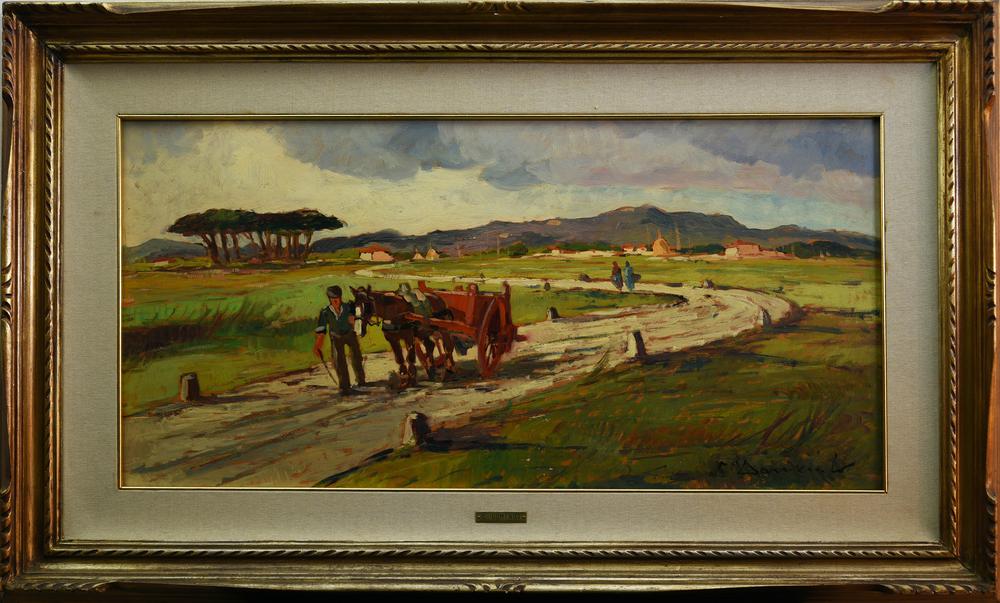 Lot 685 | Carlo Domenici PAESAGGIO CON CARRO olio su faesite, cm 40x80 firma
