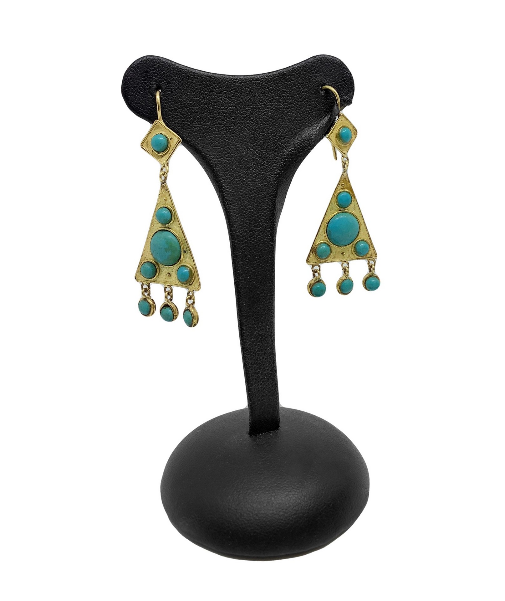 Orecchini pendenti in oro con turchesi Gr 8.3. Lunghezza 5 cm Forma triangolare. Oro basso titolo.Forma triangolare. Oro basso titolo.