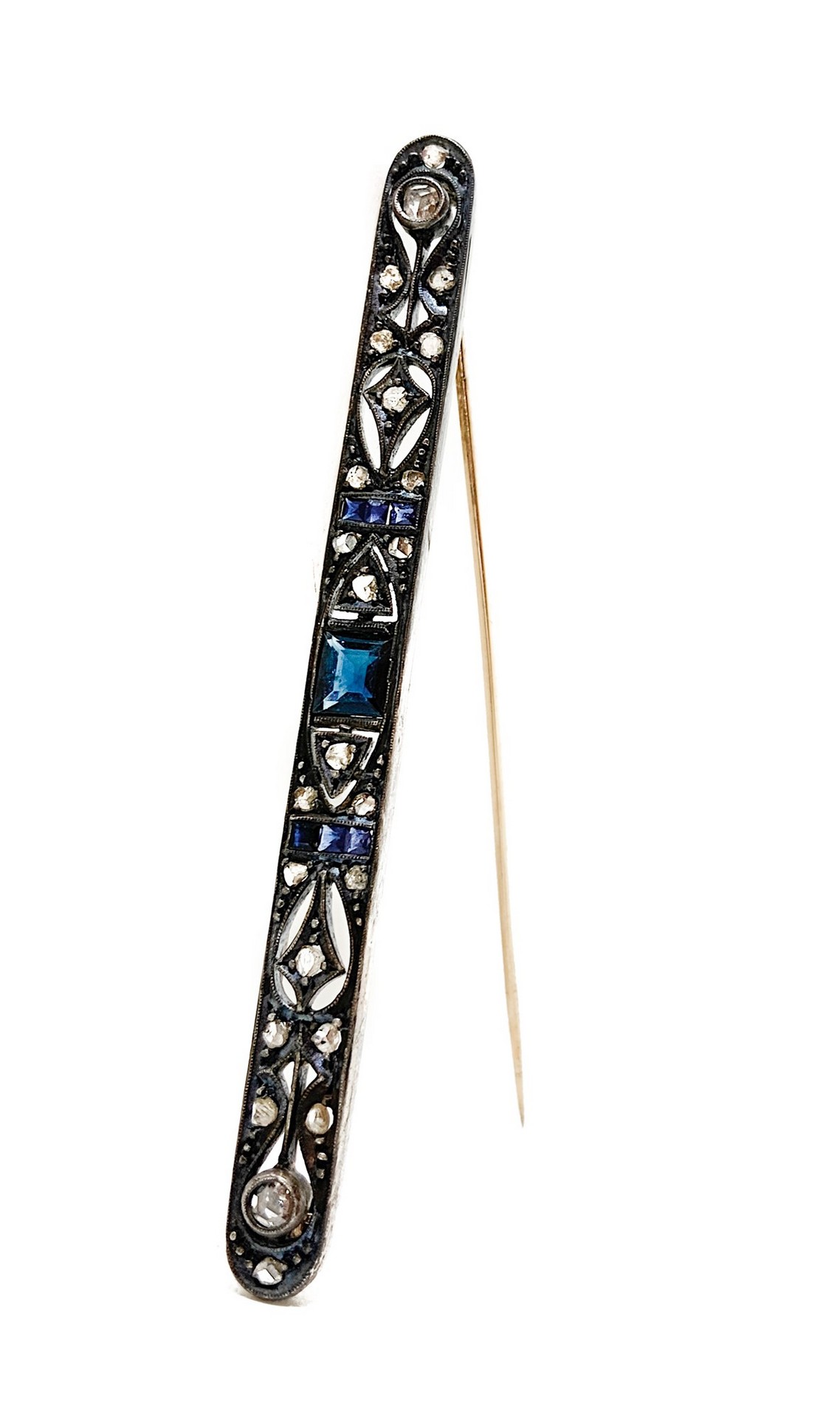 Spilla Decò, 20° secolo Gr. 6,2 Lavorazione in argento con zaffiro centrale e rose coronéLavorazione in argento con zaffiro centrale e rose coroné