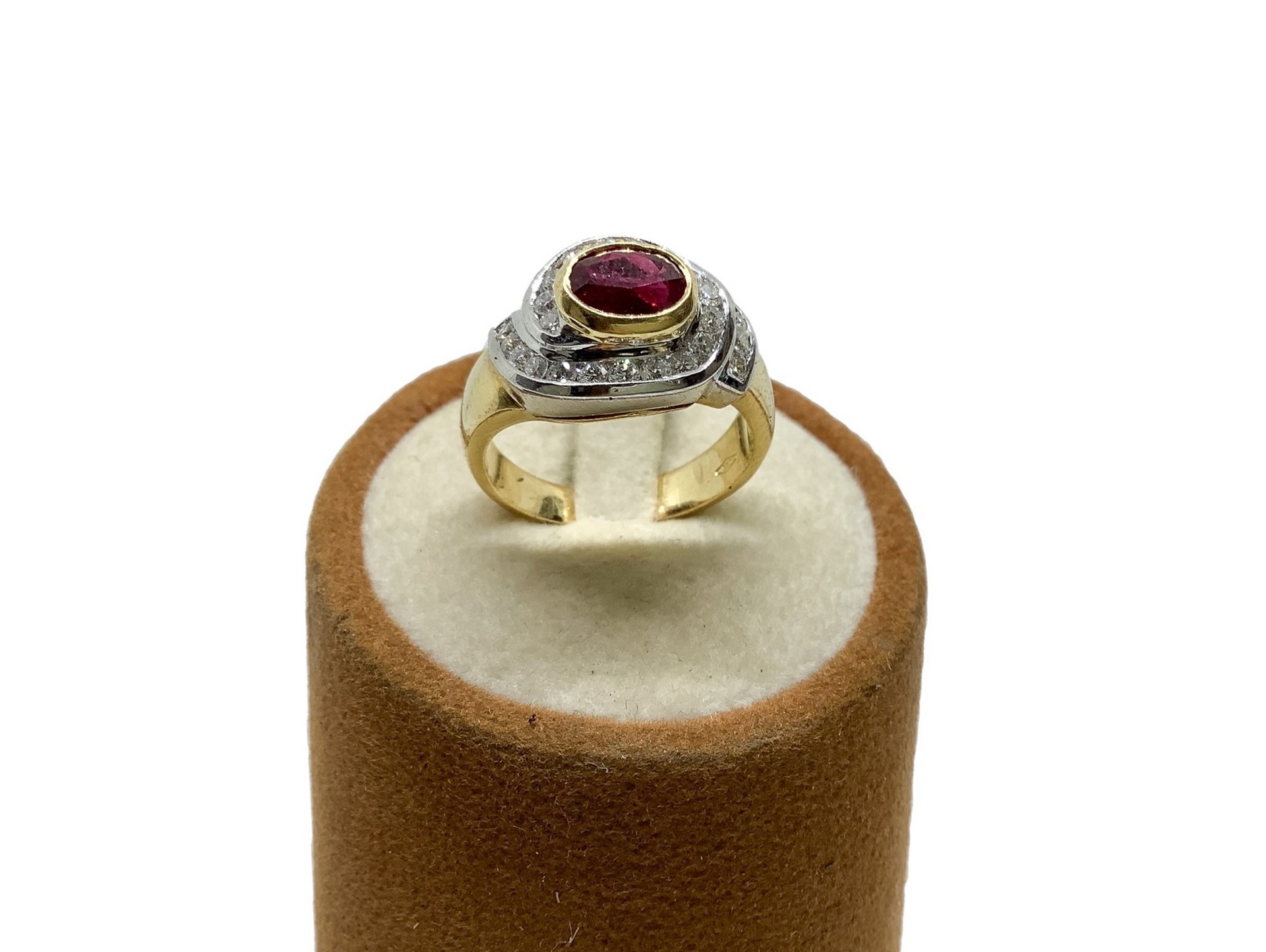 Anello in oro giallo e bianco, centrale di rubino e corona di brillanti 8 gr., misura 11