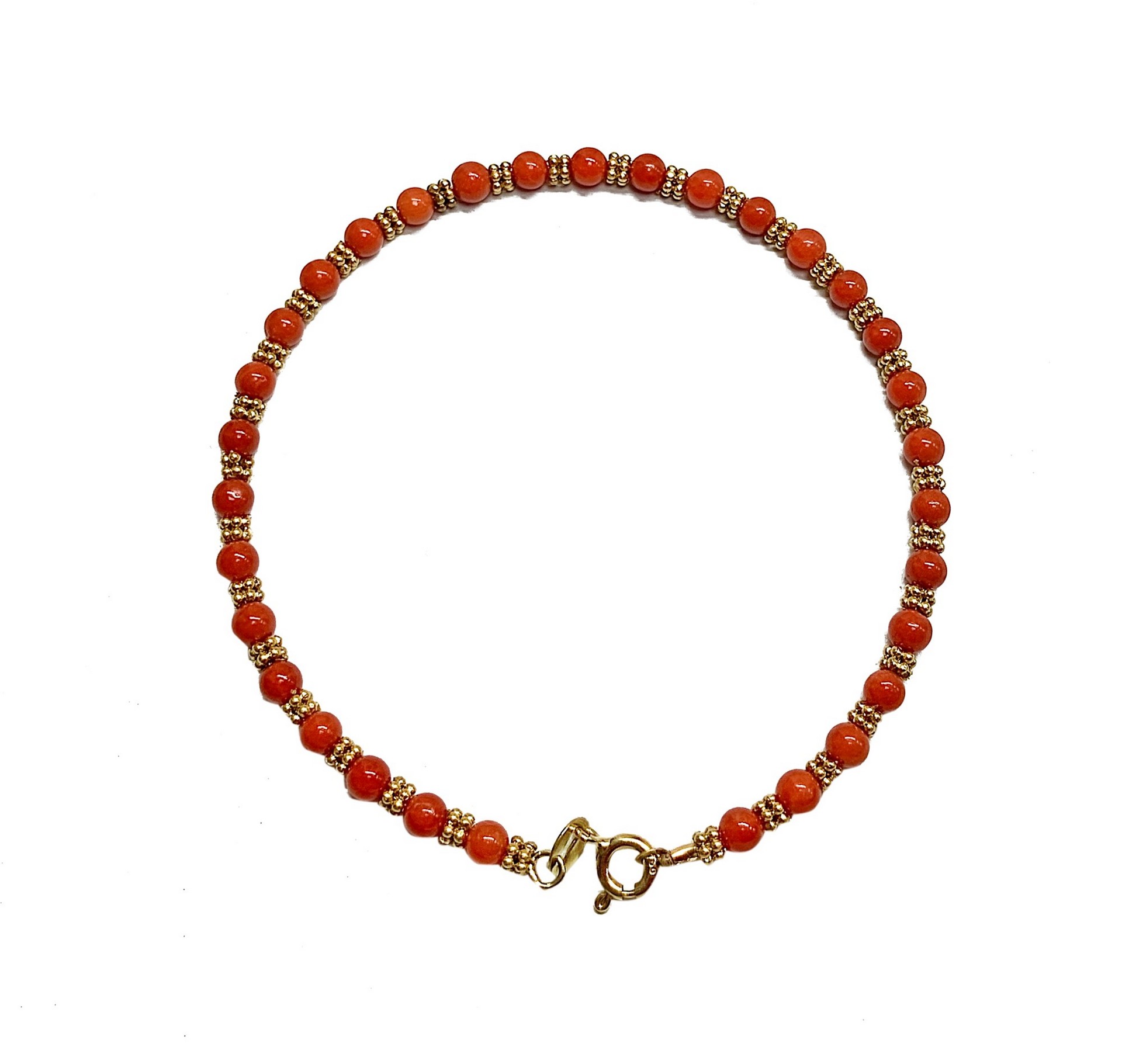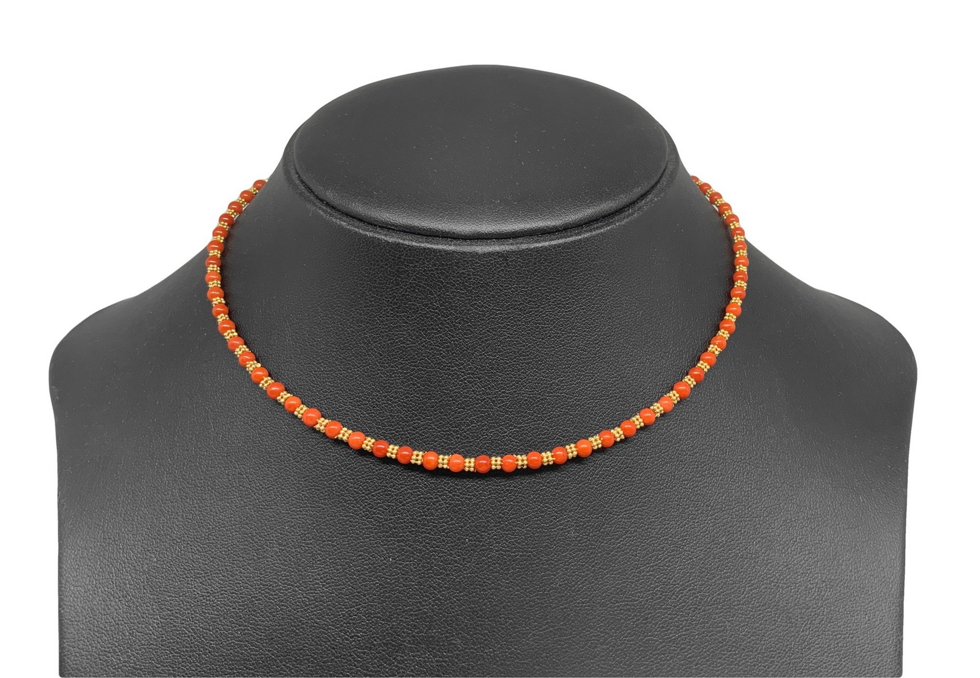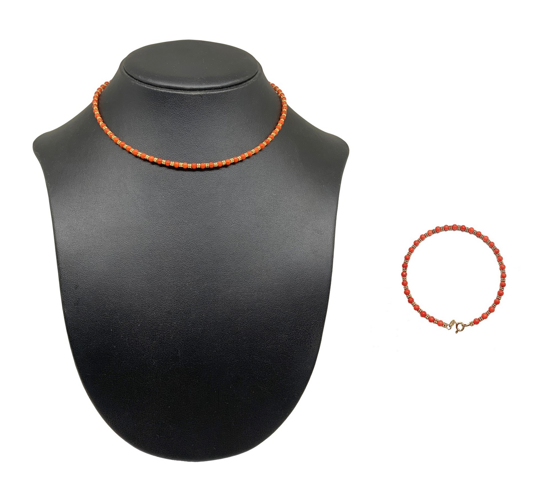 Parure collana e bracciale, 20° secolo Gr. 14,5 Girocollo e bracciale in oro rosso con sfere corallo Girocollo e bracciale in oro rosso con sfere corallo