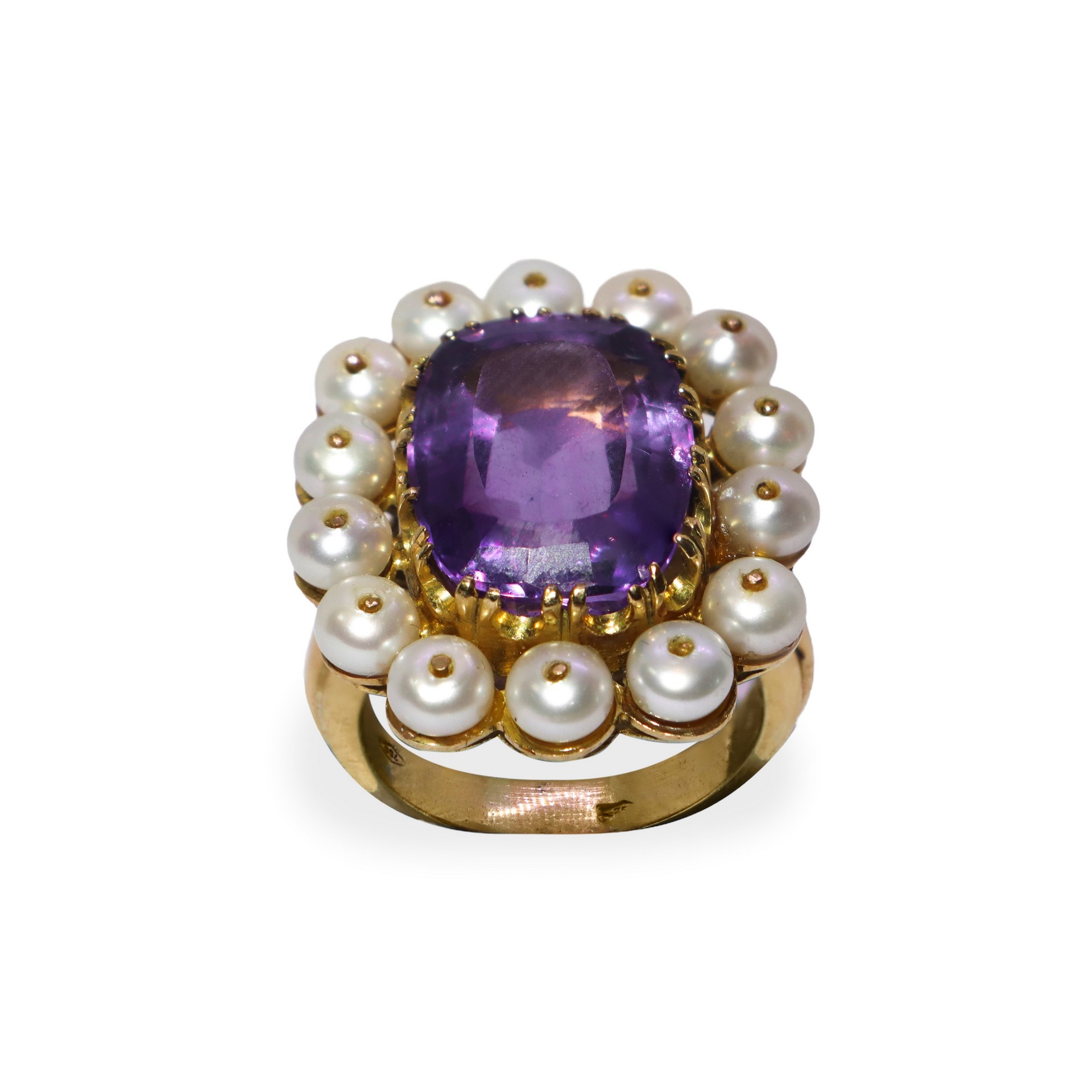 Anello in oro 18 kt con pietra viola e giro di perle, Vintage, 80s gr 18,5
