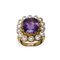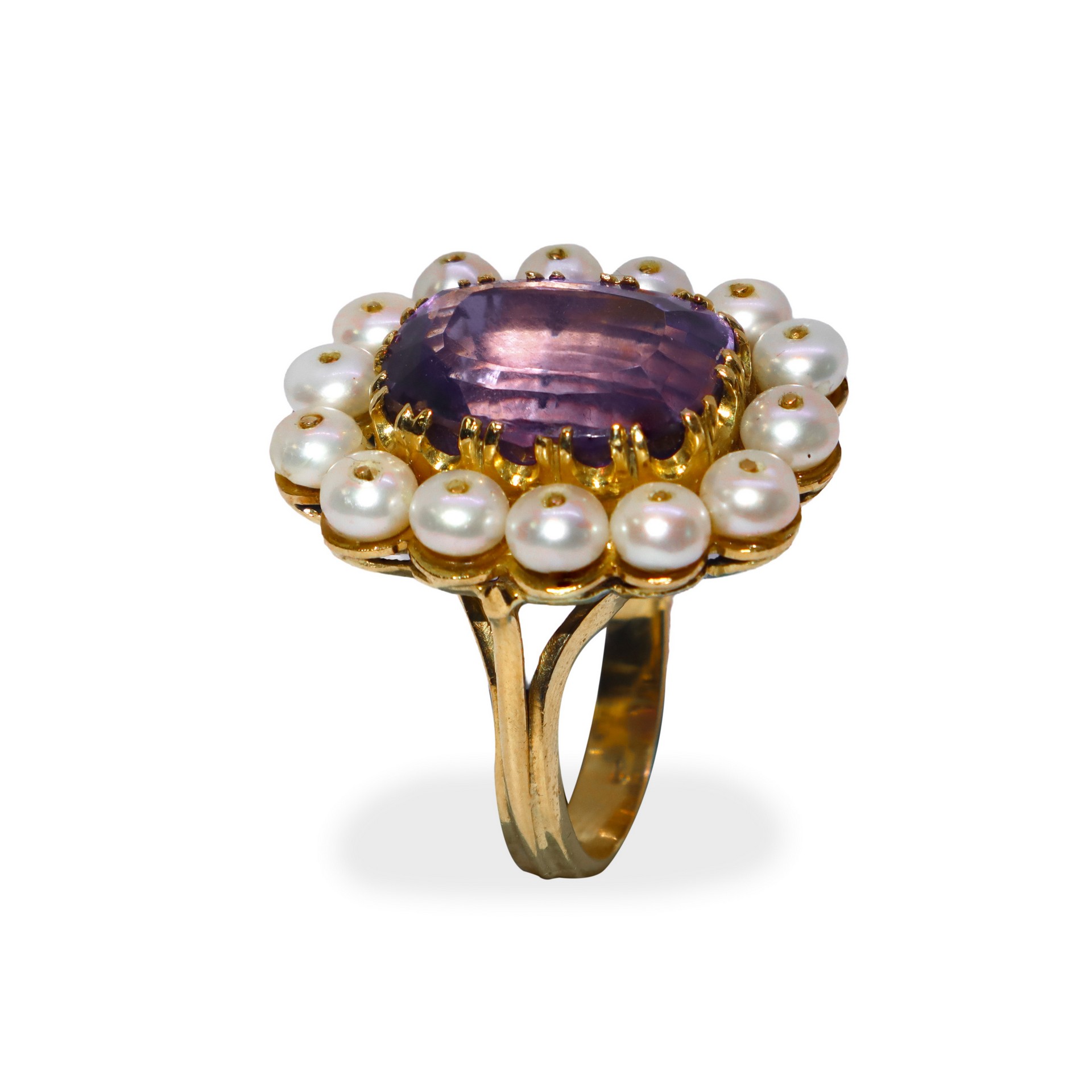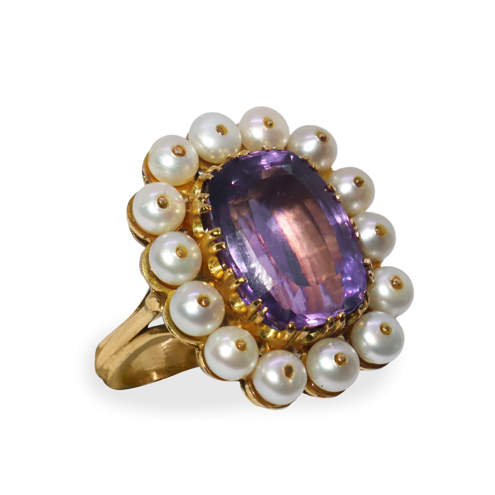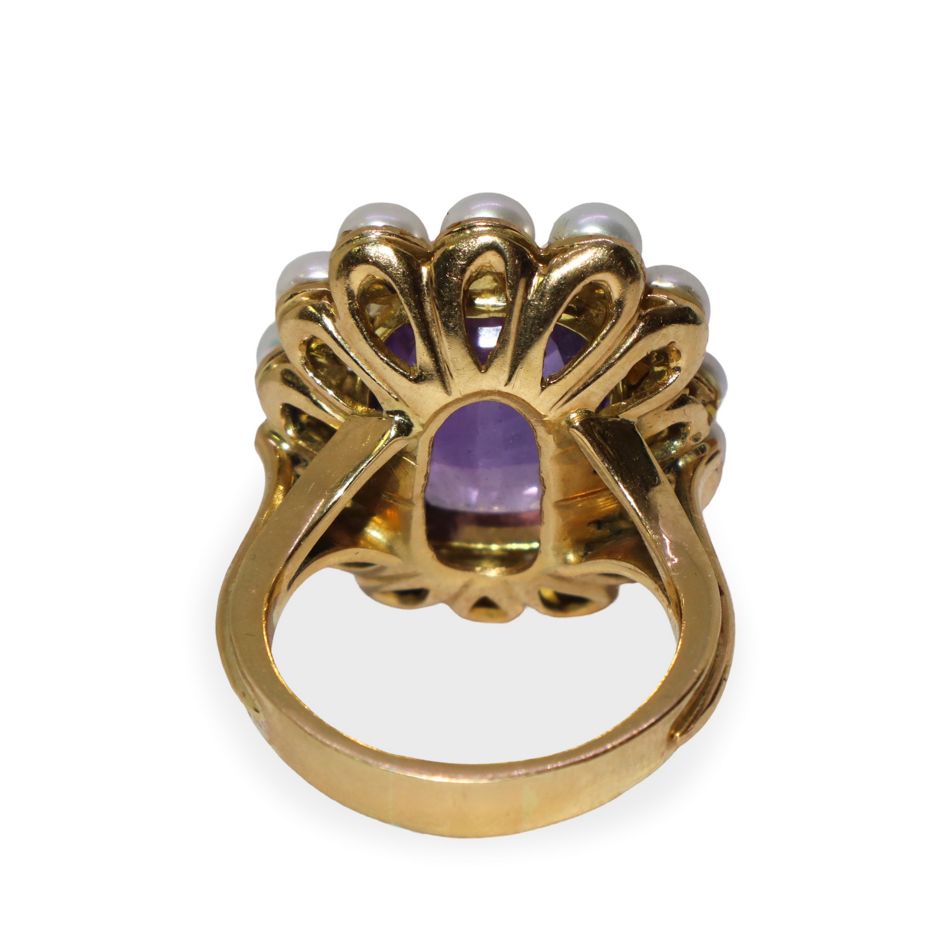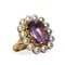Anello in oro 18 kt con pietra viola e giro di perle, Vintage, 80s