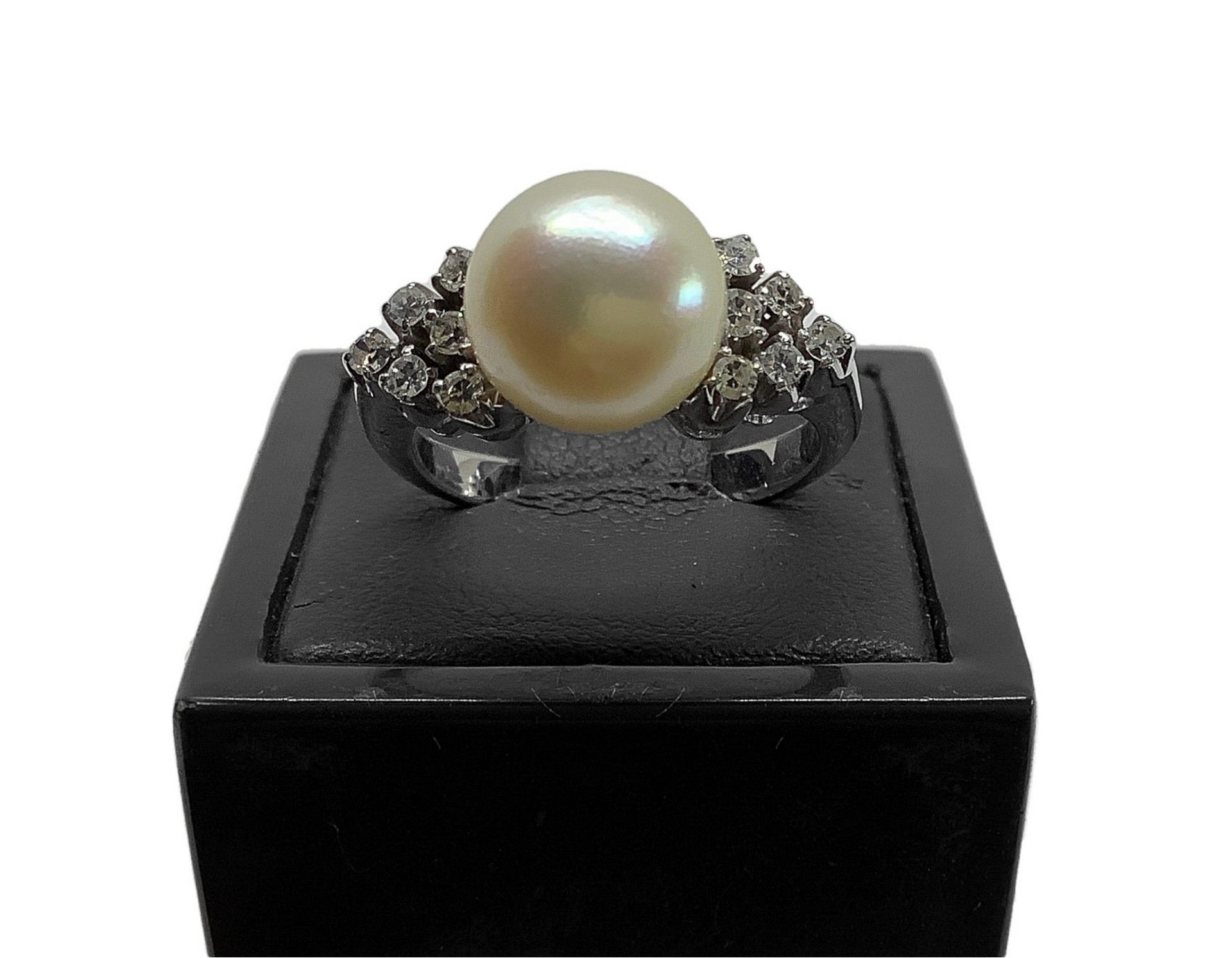 Anello in oro, 20° secolo 4,8 gr, misura 10 Lavorazione in oro bianco, perla centrale, lavorazione laterale con brillantini.Lavorazione in oro bianco, perla centrale, lavorazione laterale con brillantini.