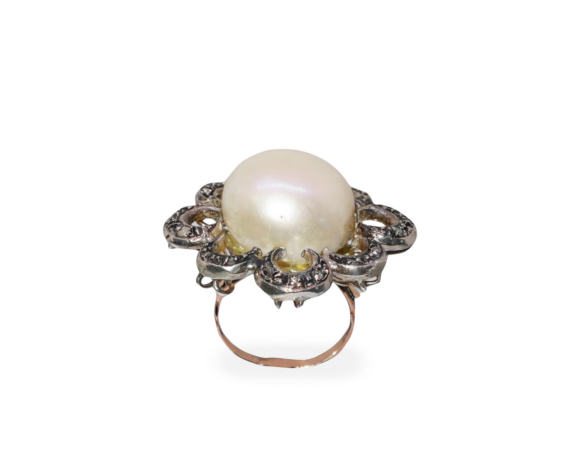 Anello in oro basso titolo e argento, con perla centrale e scaglie di diamanti