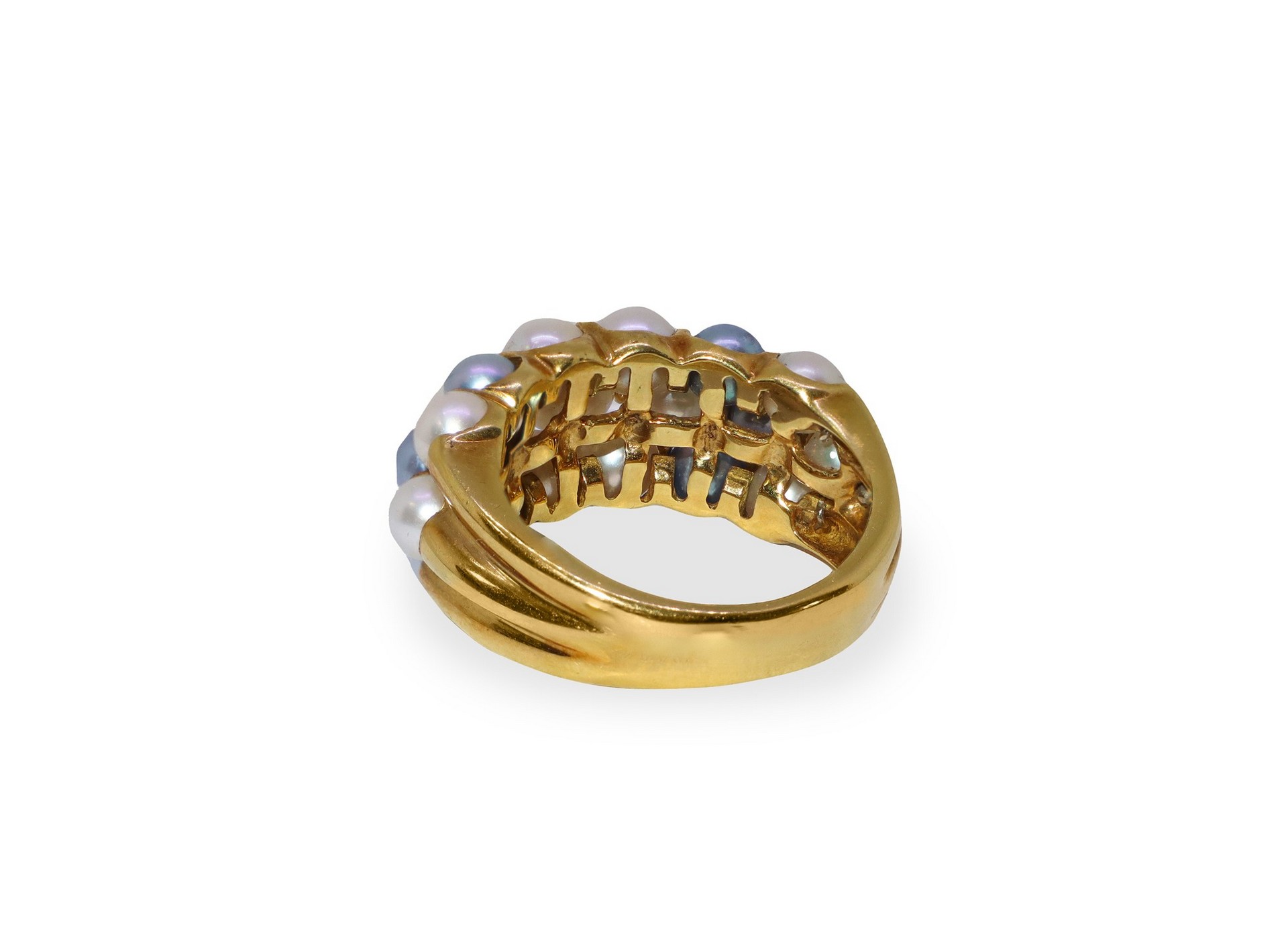 Anello in oro giallo con perle grigie e bianche giapponesi Gr. 9.4 Firmato Nikawa.Firmato Nikawa.