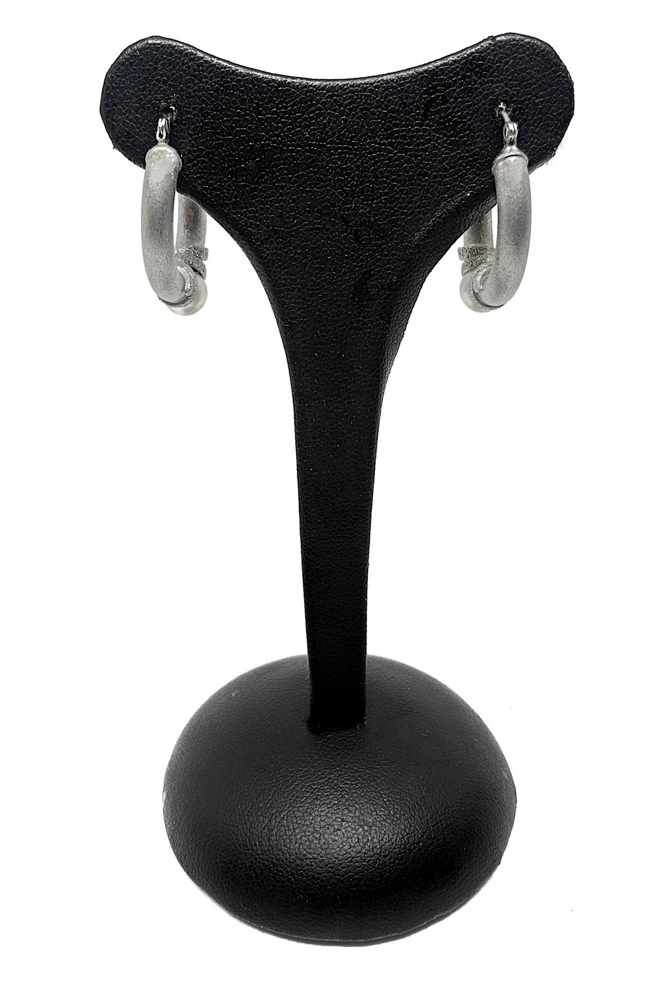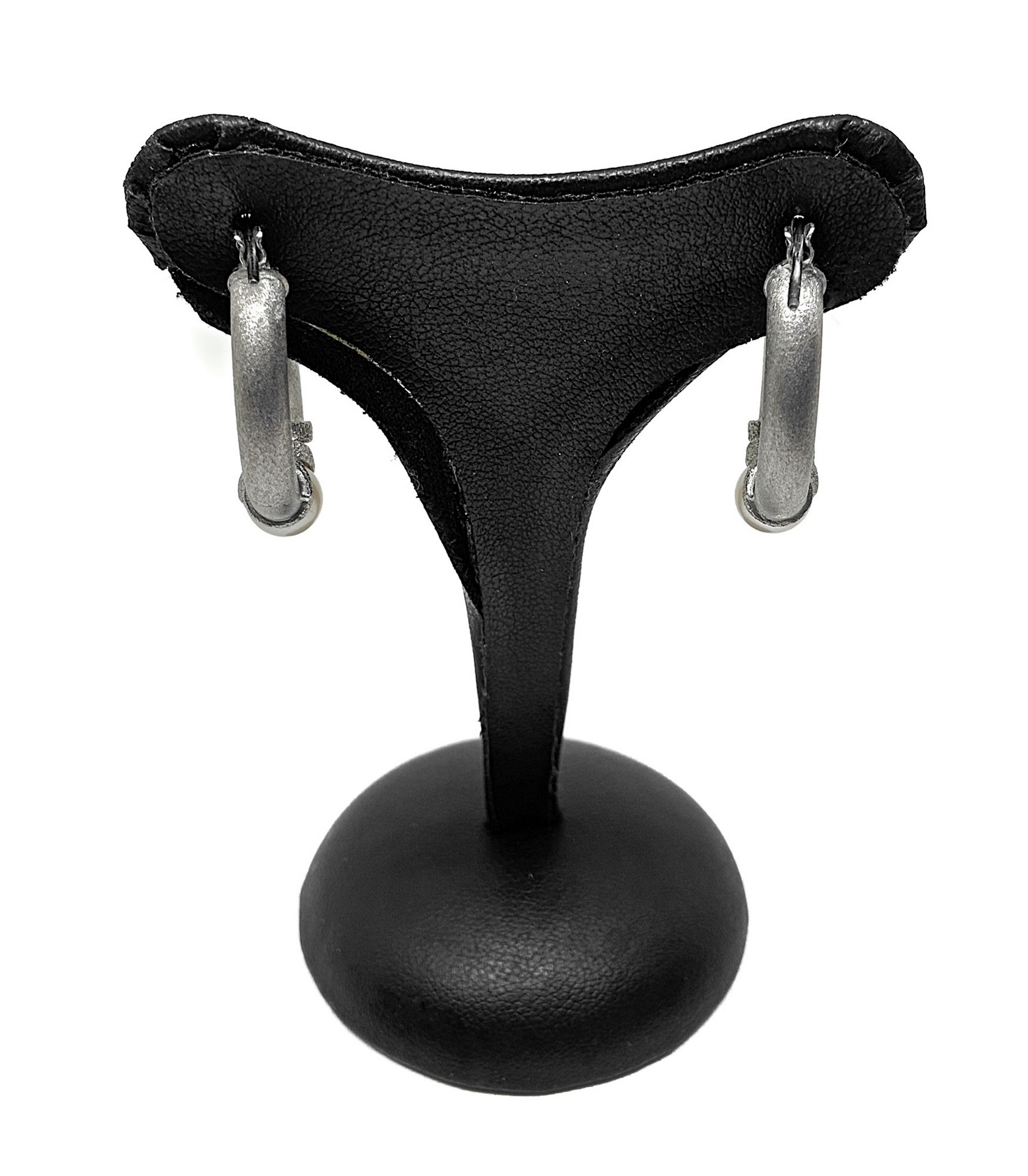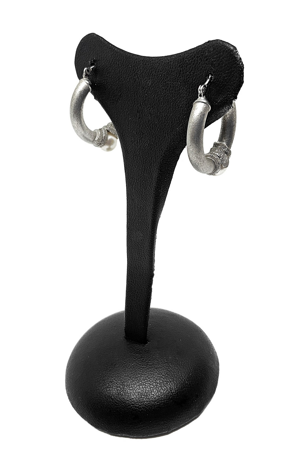 Orecchini in oro a cerchio , 20° secolo Gr. 5,8 Lavorazione in oro bianco satinato con centrale con perla circondata da scagliette di brillantini.Lavorazione in oro bianco satinato con centrale con perla circondata da scagliette di brillantini.