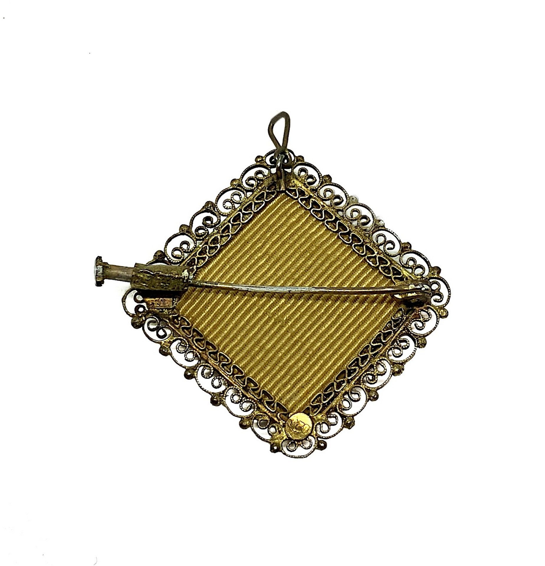 Spilla-pendentif in oro , 20° secolo Gr. 6,2 Lavorazione in oro rosso a filigrana con miniatura raffigurante Madonna.Lavorazione in oro rosso a filigrana con miniatura raffigurante Madonna.