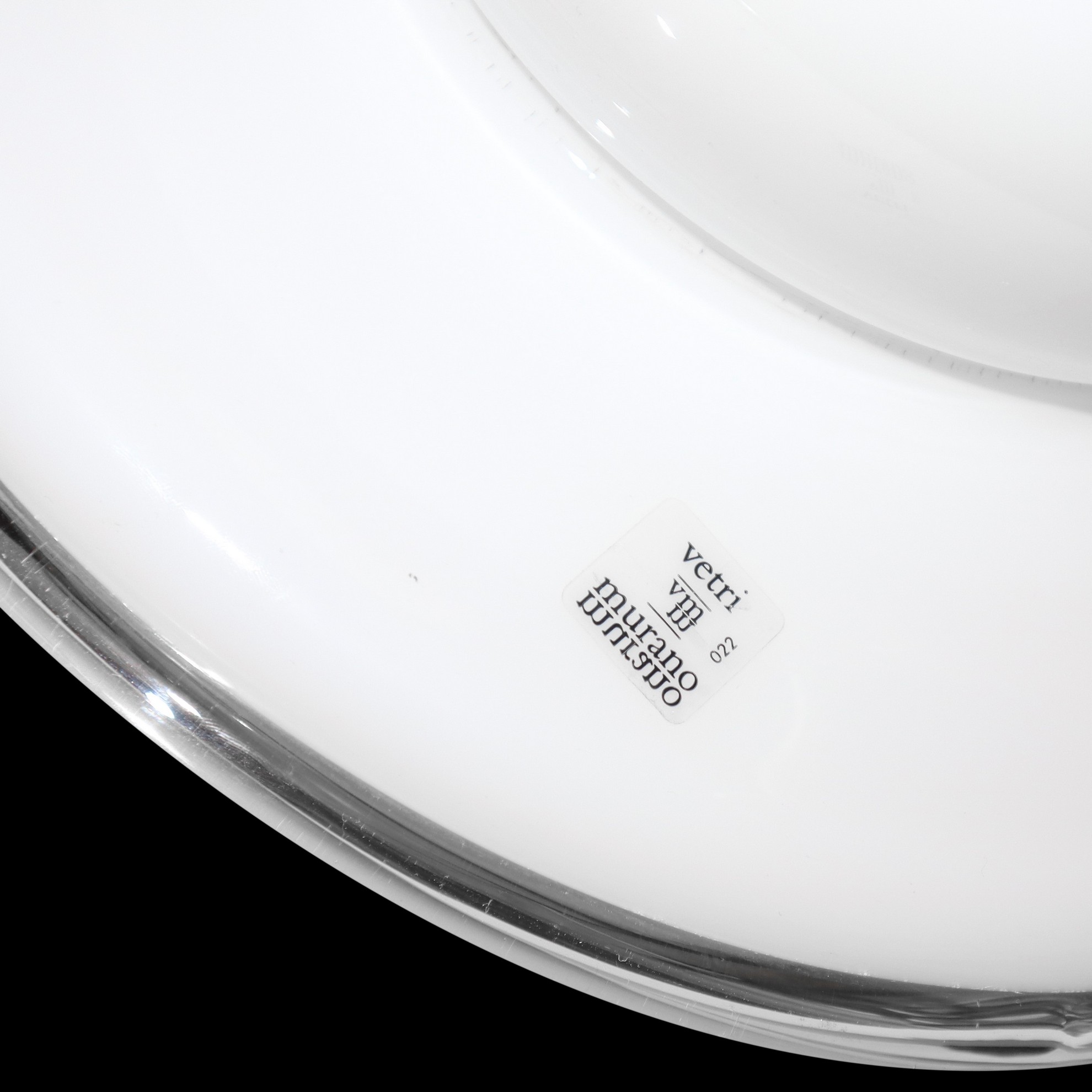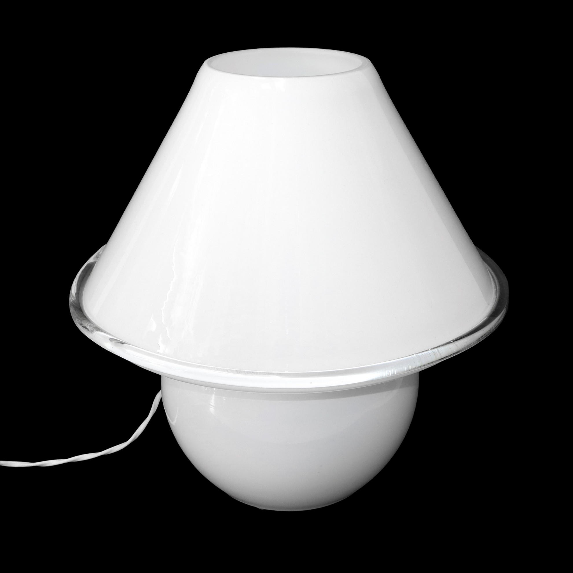 Noti Massari Giusto Toso per Leukos - Lampada da tavolo in vetro vetro lattimo incamiciato H cm 36 x L cm 34 Applicazione di pasta vitre trasparente lungo bordo. Segni di uso. Etichetta Vetri murano. Impianto originale del periodo.Applicazione di pasta vitre trasparente lungo bordo. Segni di uso. Etichetta Vetri murano. Impianto originale del periodo.
