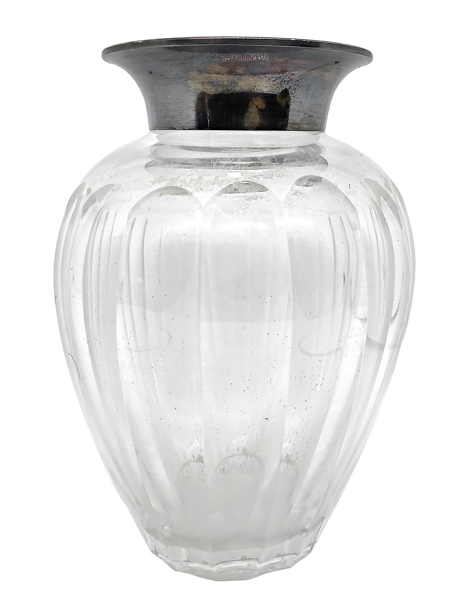 Wilhelm Binder - Vaso in vetro pesante costolato con bocca argentata, circa 1920 h 17 cm, bocca d 10 cm Disegnato dal famoso argentiere Wilhem Binder, di Schwabisch Gmund, all'epoca centro dell'argenteria tedesca.Disegnato dal famoso argentiere Wilhem Binder, di Schwabisch Gmund, all'epoca centro dell'argenteria tedesca.