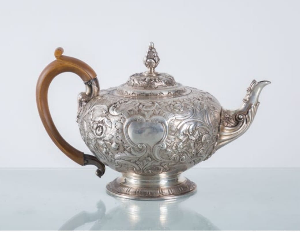 Caffettiera sbalzata e casellata. Argentieri Garrards Fanton Street, london 1823,gr 714