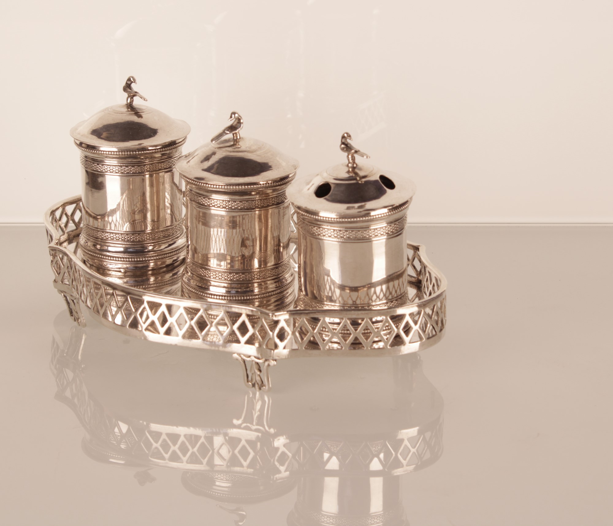 Lot 82 | Servito da scrittoio inglese in Sheffield composto da due porta inchiostro e portapenne.