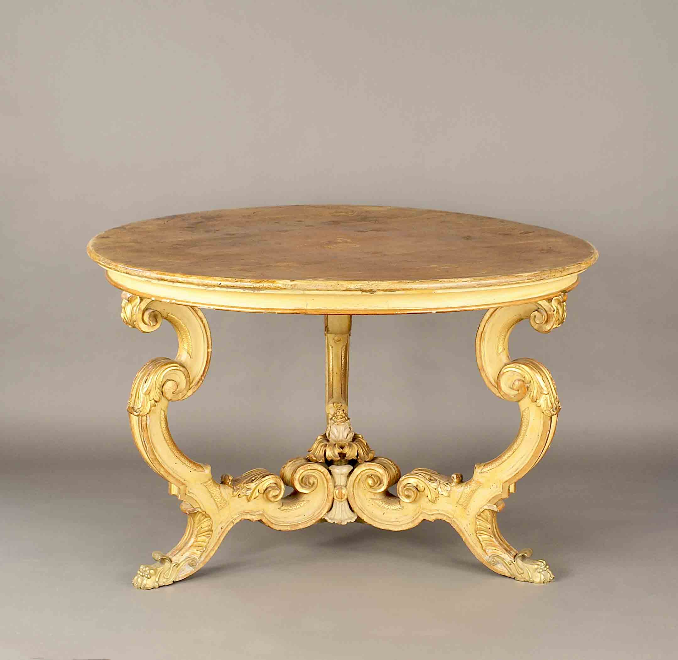 Lot 86 | Tavolo in legno laccato e parzialmente dorato, piano circolare poggiante su 3...