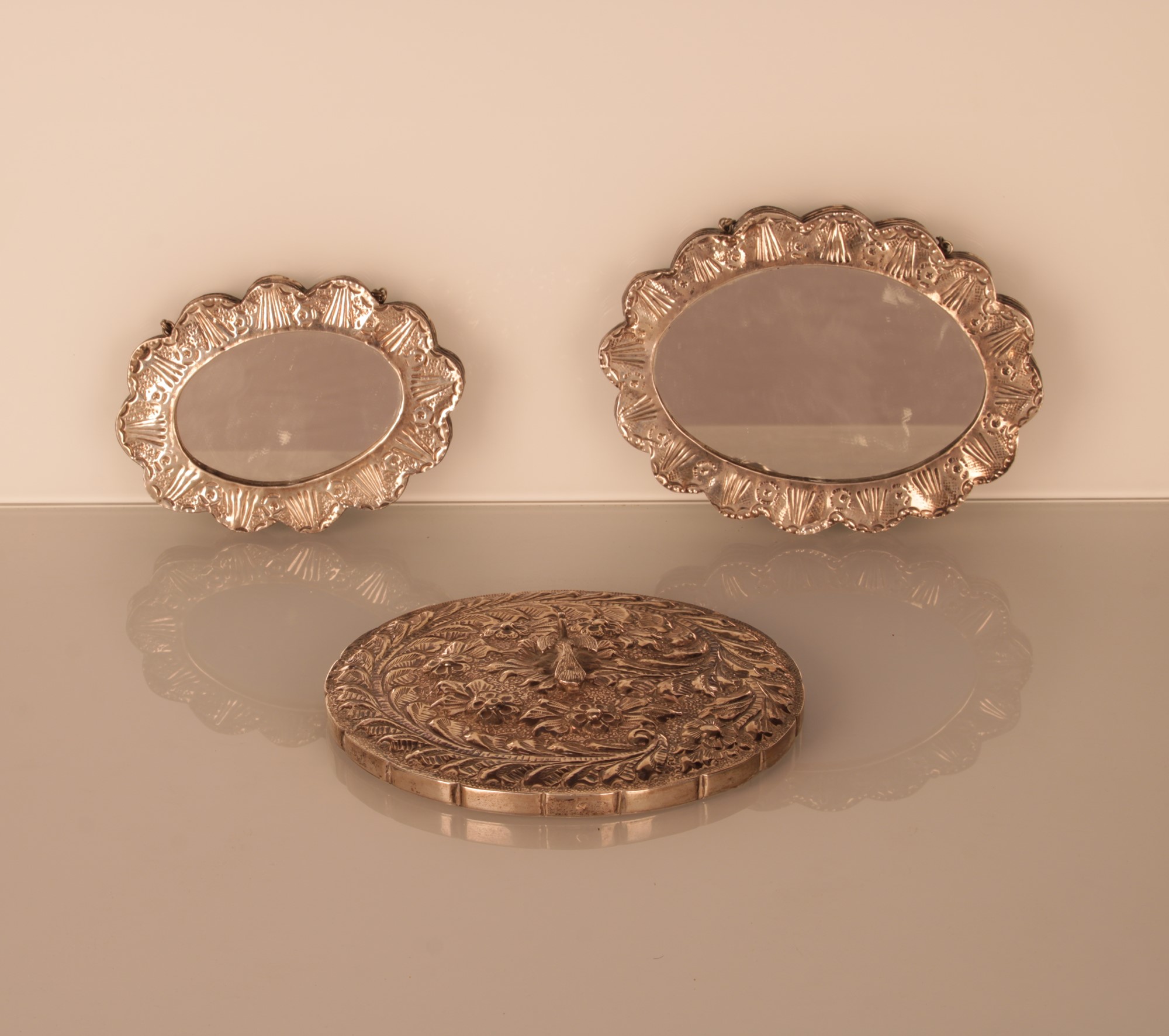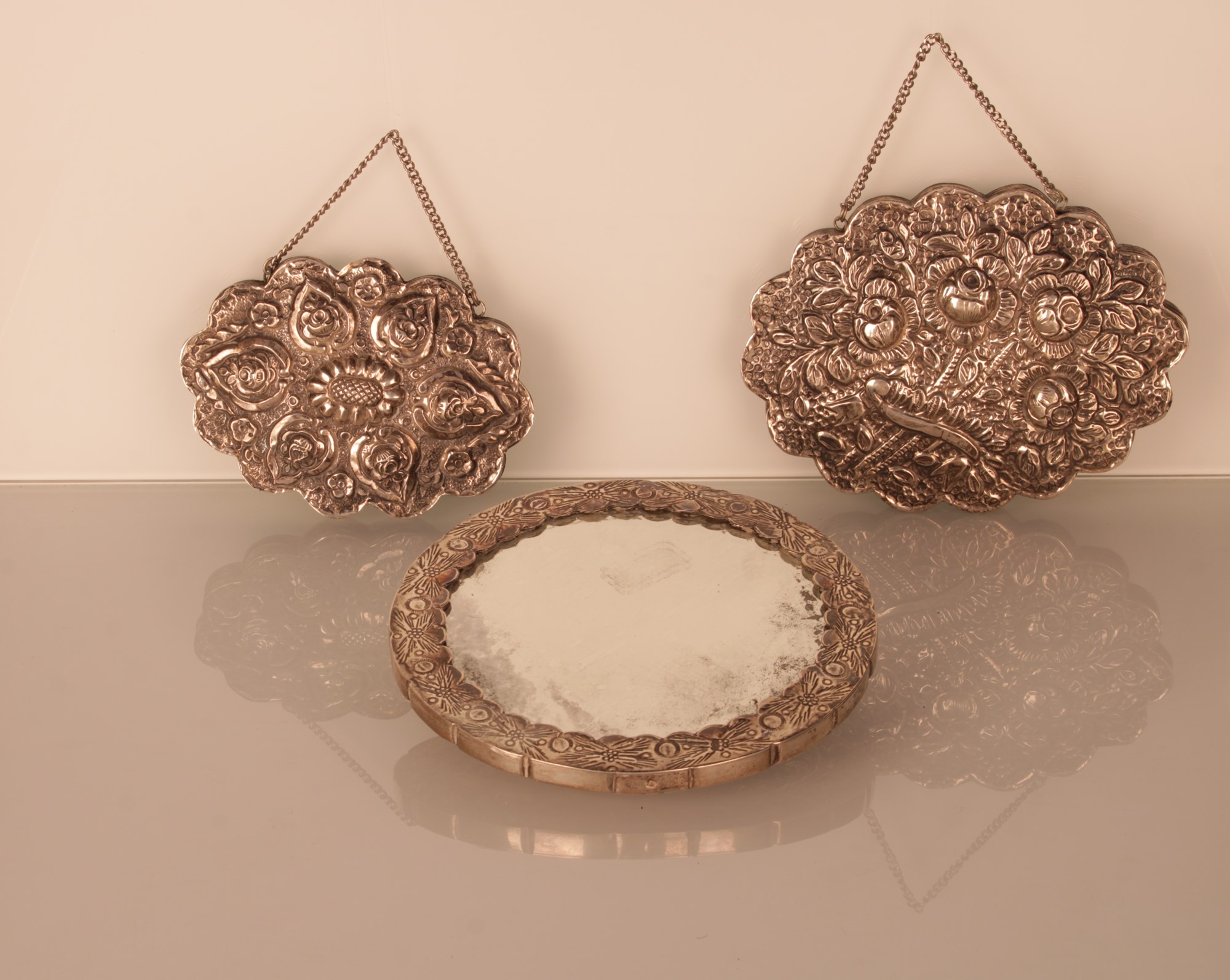 Lotto di tre specchi "a fiore" in argento 800/1000 con catenella, due ovali ed uno tondo